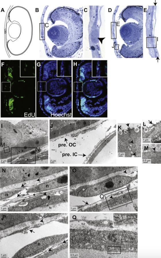 Fig. 4. Xenopus cornea at stage 41. (A) Schematic drawing of stage 41 eye. (BâE) Plastic section image of stage 41 eye (B, D) and cornea (C, E). Embryonic epidermis and endothelium associate via a small group of cells in the central cornea (arrowhead in C). The second migratory wave is seen invading the matrix as indicated by arrows in (E). (FâH) Proliferation assay. EdU (F), Hoechst (G), and overlaid (H). (IâQ) EM images of a plastic section adjacent to that displayed in panels D and E. (I) EM image showing structure at the center of the cornea. (J) At the periphery, segregation of presumptive outer cornea and inner cornea (arrows) is observed. (KâM) Tight junctions (arrows) and desmosomes (arrowheads) are observed between two goblet cells (K), between one goblet cells and one ciliated cell (L), and between one apical epidermal cell and one basal epidermal cell (M). (NâP) EM images showing the second wave of migrating mesenchymal cells, with N being closest to central cornea and P being closest to peripheral cornea. The migrating mesenchymal cells have big nuclei (n) with thin and long cell processes, shown by arrows. The primary matrix is invaded by mesenchyme and split up into two parts, indicated by arrowheads. (Q) High magnification image showing the cellular contents and the absence of intercellular junctions between two presumptive corneal endothelial cells (inset). Abbreviations: pre. OC, presumptive outer cornea; pre. IC, presumptive inner cornea; n, nucleus.