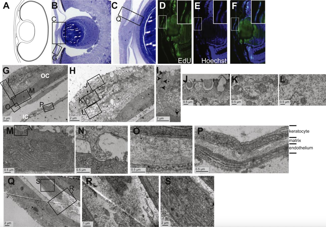 Fig. 5. Xenopus cornea at stages 43â45. (A) Schematic drawing of stage 43â45 eye. (BâC) Plastic section images of stage 43â45 eye (B) and cornea (C). (DâF) Proliferation assay. EdU (D), Hoechst (E), and overlaid (F). (GâS) EM images of a plastic section adjacent to that displayed in panels B and C. (G) EM image showing the multiple layered structures of the outer cornea and inner cornea. (H) The outer cornea comprises four layers. (I) Mature intercellular junctions are identified between epidermal cells, indicated by arrowheads. (JâL) High magnification images of the cellular contents of a goblet cell in apical to basal order. (M) A typical basal epidermal cell contains extensive ER in the cytoplasm. (N) Active communication observed between apical and basal epidermal cells. (OâP) EM images of the matrix and presumptive keratocyte layer of the outer cornea (O), and the structure of the inner cornea (P). (QâS) The central connection is composed of cuboidal cells (S) surrounded by a matrix material (R). Abbreviations: OC, outer cornea; IC, inner cornea.