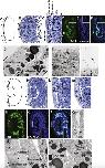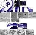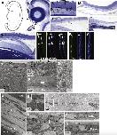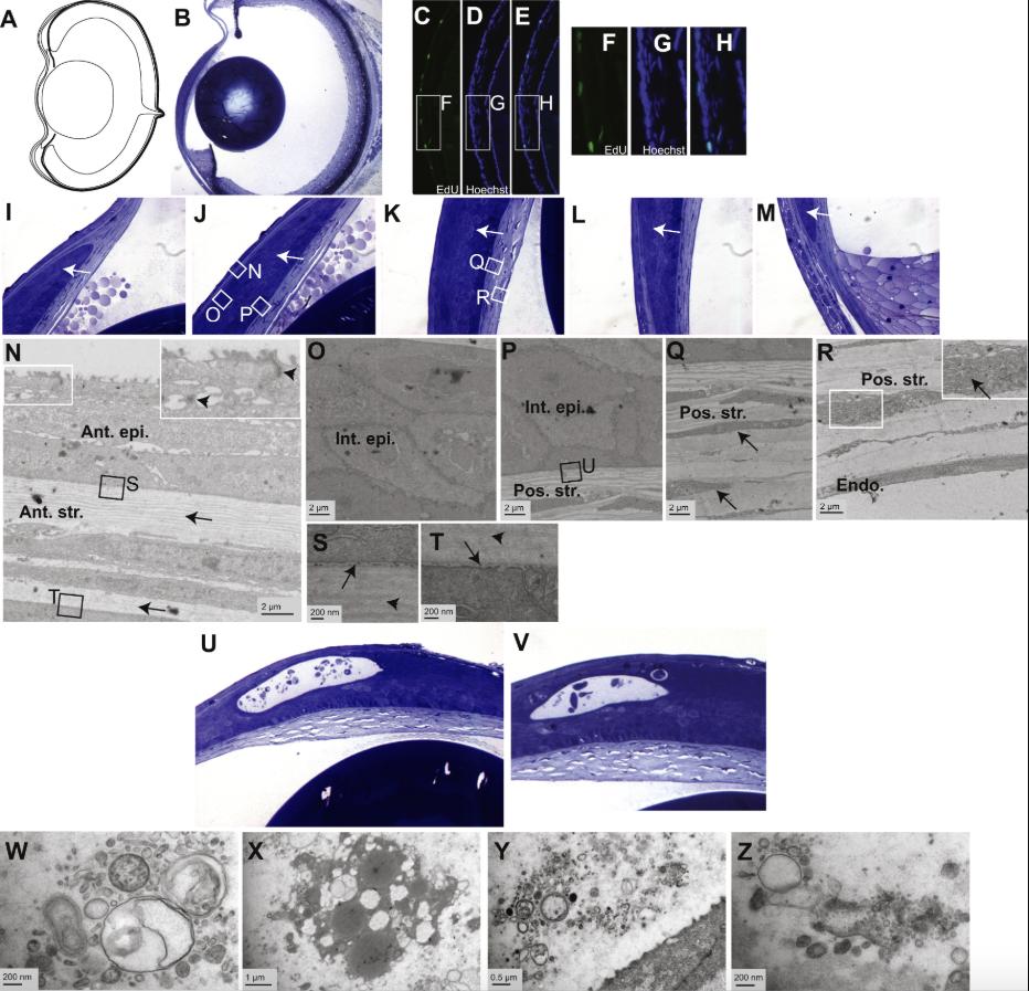 Fig. 10. Xenopus cornea at stage 62. (A) Schematic drawing of stage 62 eye. (B) Histology of stage 62 eye. (CâH) Proliferation assay. EdU (C, F), Hoechst (D, G), and overlaid (E, H). (IâM) Plastic section images of stage 62 cornea taken in dorsal to ventral order. The intra-stromal epithelial mass is indicated with arrows. (NâT) EM images of a plastic section adjacent to that displayed in panels IâM. (N) EM image showing the anterior epithelium and anterior stroma. Collagen fibers in the anterior stroma are indicated by arrows. Tight junctions (arrowheads) can be observed between anterior epithelial cells. (OâR) High magnification images of the intra-stromal epithelial mass (O), border of intra-stromal epithelial mass and posterior stroma (P), posterior stroma (Q), posterior stroma-endothelium border (R). Keratocytes (arrows in Q) lie parallel to the collagen lamellae and rough ER can sometimes be observed (arrow in R). (SâT) High magnification images showing dark staining particles (arrows) on the anterior epithelium-anterior stroma border (S) and the anterior stroma-intra-stromal epithelial mass border (T). Collagen bundles are indicated by arrowheads. (UâV) Plastic section images showing the apoptotic cells in the epithelium. (WâZ) EM image showing structures present in the apoptotic space. Abbreviations: ant epi, anterior epithelium; ant str, anterior stroma; int epi, intrastromal epithelium; pos str, posterior stroma; endo, endothelium.