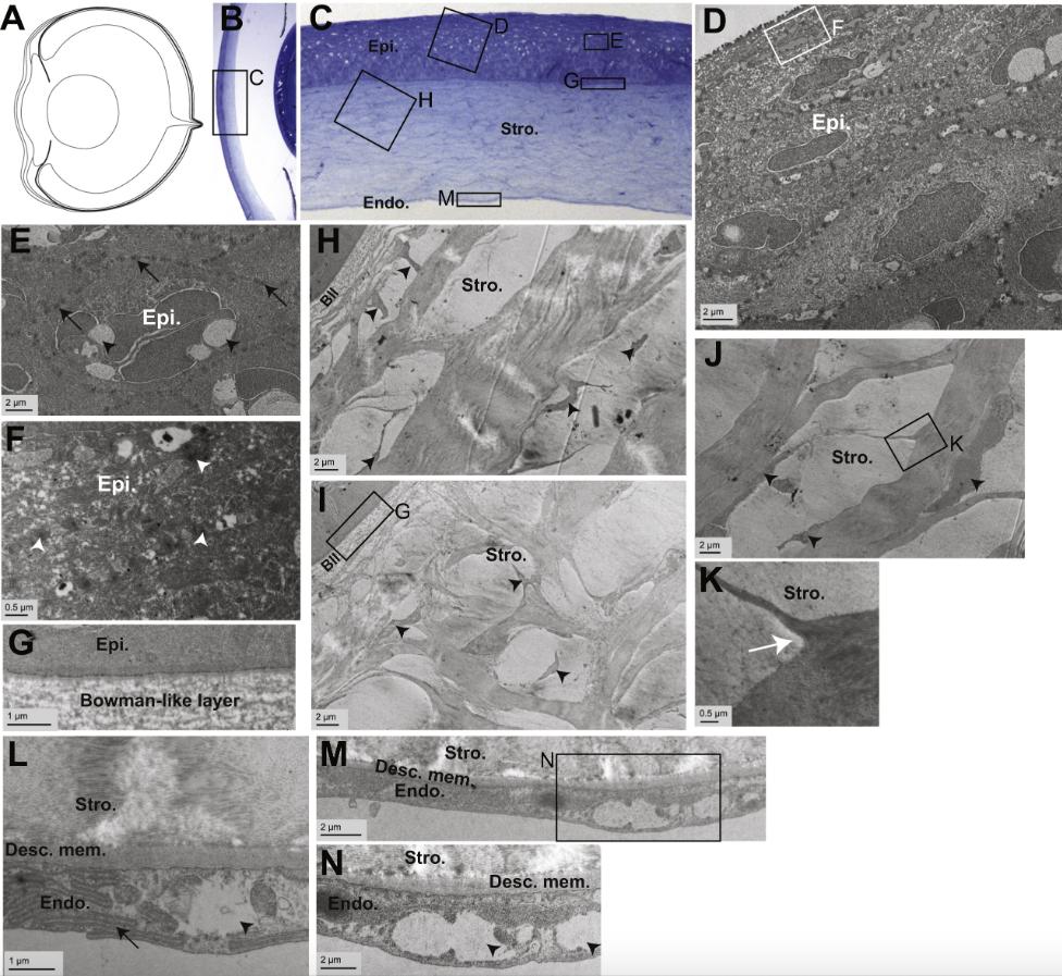 Fig. 12. Adult Xenopus cornea. (A) Schematic drawing of a 2 year-old adult eye. (B) Histology of the anterior segment of 2 year-old adult eye. (C) Plastic section image of the adult cornea. (DâN) EM images of a plastic section adjacent to that displayed in panels B and C. (D) EM image showing the mature epithelium. (E) High magnification image of one typical epithelial cell. Intercellular junctions are indicated by arrows and intracellular storage granules are indicated by arrowheads. (F) High magnification image of apical epithelial cells and the intercellular junctions (arrowheads). (G) EM image showing the basal epithelium and the Bowman-like layer. (HâI) EM images showing adult corneal stroma. Keratocytes are indicated by arrowheads. (JâK) High magnification EM images showing the arrangements of collagen fibers. In (J), keratocytes are indicated by arrowheads. In (K), the arrow indicates the branching point of a collagen fiber. (LâN) EM images showing Descemet's membrane and the endothelium containing fluid-filled vesicles (arrowheads). In (L), the arrow indicates the unique highly convoluted lateral membrane of a typical endothelial cell. Abbreviations: epi, epithelium; stro, stroma; endo, endothelium; Bll, Bowman-like layer; Desc.mem, Descemet's membrane.