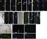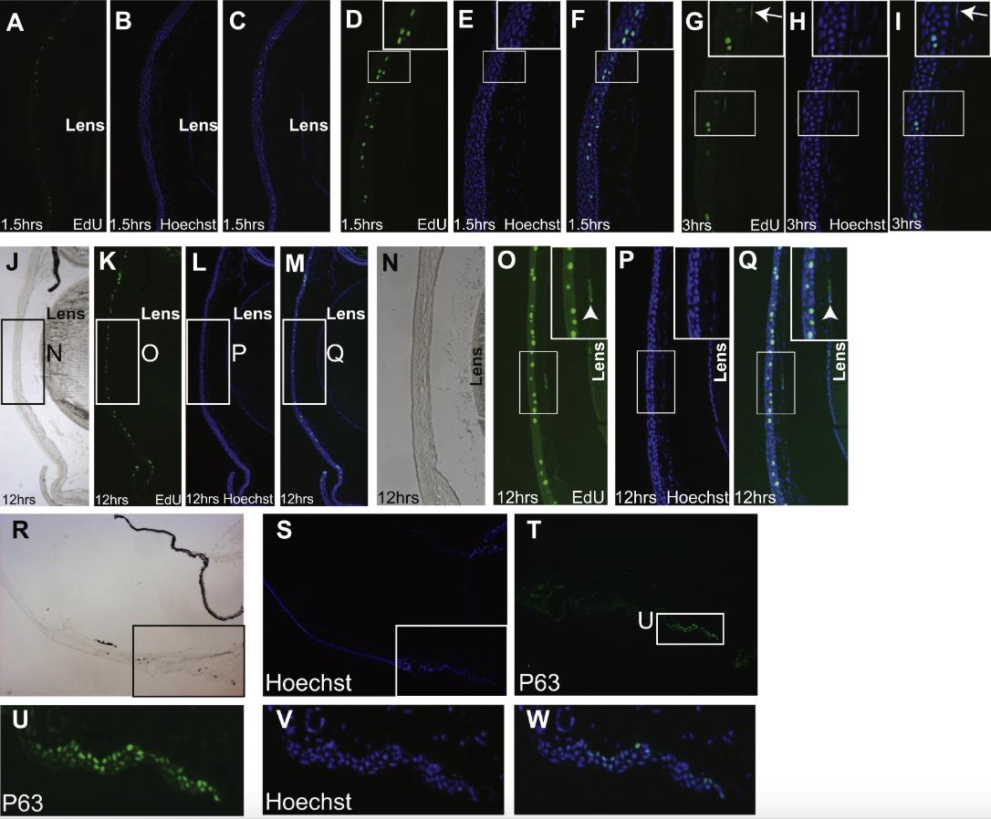 Fig. 13. Proliferative capacity of the cells in Xenopus adult cornea. (AâQ) Proliferation assays of 1.5 h labeling (AâF), 3 h labeling (GâI), and 12 h labeling (JâQ). Brightfield (J, N), EdU (A, D, G, K, O), Hoechst (B, E, H, L, P), overlaid (C, F, I, M, Q). In (G) and (I), proliferative keratocyte is indicated by an arrow. In (O) and (Q), proliferative endothelial cell is shown by an arrowhead. (RâW) Immunostaining of mature cornea using p63 antibody at low (R, S) and high (TâW) magnifications. Brightfield (R), p63 (T, U), Hoechst (S, V), overlaid (W).