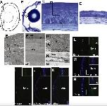 Fig. 1. Xenopus cornea at stage 25 and stage 30. (A) Schematic drawing of a stage 25 eye. (BâC) Plastic section images of stage 25 eye (B) and the epidermis overlying the developing retina at this stage (C). (DâF) Proliferation assay of stage 25 cornea. EdU (D), Hoechst (E), and overlaid (F). Arrow indicates a dividing cell in the basal corneal epidermis overlying the optic cup. (GâI) EM image showing the two-layered structure of the epidermis in the stage 25 cornea. The apical epidermis consists of goblet cells (H) and ciliated cells (I). (H) shows that mucus secreting vesicles (arrow) form on the apical plasma membrane in a typical goblet cell and numerous mitochondria (arrowheads) close to the cell membrane indicate the active status of the cell. Ciliated cells (I) possess long cilia on the apical membrane, the cross-section of which is indicated by an arrow here. (J) Schematic drawing of stage 30 eye. (KâM) Plastic section images of stage 30 eye (K), cornea (L) and the periocular region (M). Mesenchyme (arrow in M) migration is observed in the periocular space. (NâP) Proliferation assay of stage 30 cornea showing the actively dividing basal epidermal cells in the cornea. EdU (N), Hoechst (O), and overlaid (P). (Q) Intercellular junctional complexes are not fully formed (arrow) at this stage. (R, S) EM images of a plastic section adjacent to that displayed in panels KâM. (R) Epidermis in the cornea retains its two-layered structure, (S) the basal epidermis cells closely associate with the presumptive lens cells.