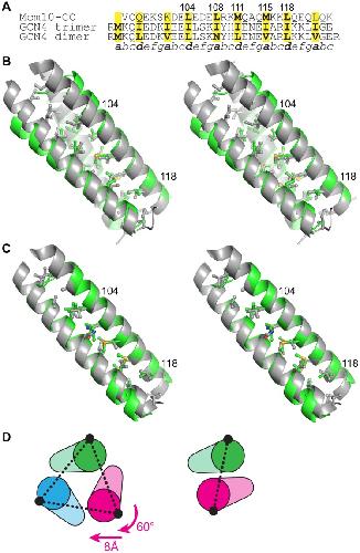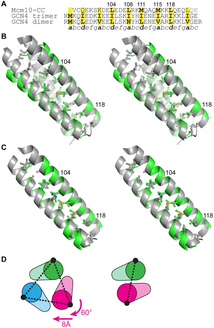 Figure 4. A model of the dimeric Mcm10 CC.(A) Structure-based sequence alignment between Mcm10 CC and the trimeric and dimeric forms of GCN4 CC. (B) Stereoview of the Mcm10 CC trimer (green) superimposed onto the isoleucine GCN4 trimer (grey, PDB ID 1 GCM). Side chains at the CC interface are shown, with the exception of the N-terminal methionine in GCN4. Two Mcm10 residues are labeled for orientation. The view is rotated 45° clockwise with respect to Figure 3C. (C) Stereoview of the Mcm10 CC dimer model (green) superimposed on the CGN4 CC (grey, PDB ID 2ZTA). (D) The relationship between trimer (left) and dimer (right) forms of the CC. Schematics are oriented with respect to the green helix. The conformation of the dimer can be constructed from the trimer by a 60° rotation and 8 Å translation of the magenta helix. The interhelical distances (dashed line) are 15.5 Å (trimer) and 10 Å (dimer). |