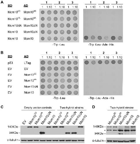 Figure 6. Coiled-coil mutations disrupt Mcm10 self-association.(A, B) Three individual strains (1, 2, 3) harboring yeast two-hybrid plasmids that express the indicated proteins either as a fusion with the Gal4-binding domain (BD) or -activation domain (AD) were spotted onto drop-out plates lacking tryptophan and leucine (-Trp -Leu) or quadruple drop-out plates lacking tryptophan, leucine, adenine and histidine (-Trp -Leu -Ade -His). Cells were spotted at a number of 2×107 (1) or a 10-fold dilution (1∶10) for full-length Xenopus Mcm10, the L104D/L108D mutant (Mcm102D), the L104A/L108A/M115A/L118A mutant (Mcm104A), and the NTD deletion mutant spanning residues 230–860 (Mcm10ΔN). p53 and large T-antigen (LTag) served as a positive control, EV indicates empty vector controls. (C) Western blot showing wild-type and mutant xMcm10 protein expression in representative strains. Gal4-AD fusions were detected by a HA-specific antibody. Strains carrying empty vector controls, or Gal4-AD fusion genes and Gal4-BD empty vectors are shown on the left (Empty vector controls). Strains expressing pair-wise combinations of the Gal4-AD and Gal4-BD fusion genes as indicated in panels A and B are shown on the right (Two-hybrid strains). Full-length xMcm10 and the 2D and 4A mutants ran at an approximate size of 140 kDa, whereas the truncated form of xMcm10 ran at an approximate size of 94 kDa. Tubulin served as a loading control. (D) Gal4-BD fusions were detected by a Myc-specific antibody. Extracts from the identical two-hybrid strains shown in (C) were loaded in the same order. The asterisk denotes a non-specific band. |