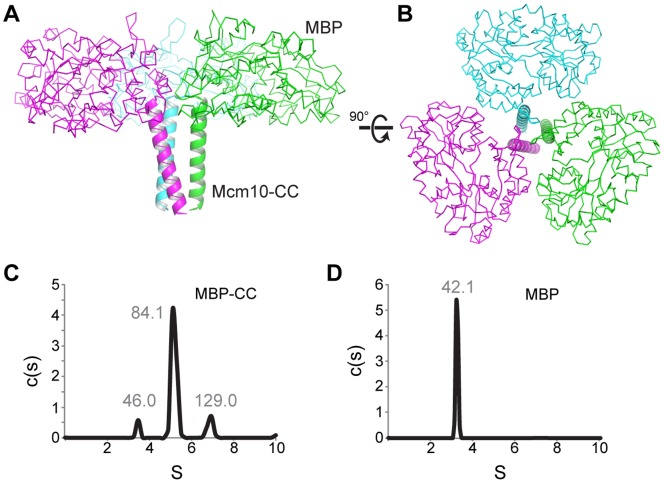 Figure 2. Trimerization of MBP-CC.(A,B) Crystal structure of the MBP-CC asymmetric unit, with each protomer colored differently. Maltose-binding protein is shown as a Cα-trace, and the xMcm10 coiled-coil is depicted as a cartoon ribbon. (C,D) Sedimentation velocity profiles of MBP-CC95–132 (C) and free MBP (D) at pH 4.7. Molecular masses (kDa) calculated from the sedimentation data are shown above each peak. The molecular mass of a single polypeptide calculated from the amino acid composition are 45.1 kDa (MBP-CC) and 40.4 kDa (MBP). |