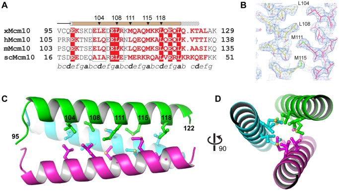 Figure 3. Crystal structure of the Mcm10 coiled-coil.(A) Sequence alignment of the coiled-coil region from Xenopus laevis (x), Homo sapiens (h), Mus musculus (m), and Saccharomyces cerevisiae (sc) Mcm10. Red boxes indicate identical amino acids. The predicted heptad repeat pattern is labeled by letters a-g at the bottom. The position of the helix is shown schematically at the top (brown, MBP-CC95â124; grey, MBP-CC95â132). (B) Composite 2FoâFc omit electron density map (contoured at 1Ï) with carbon atoms colored according to protomer. (C) Crystal structure of xMcm10-CC95â124. Residues at the interface are shown in ball and stick, and the amino acid numbers labeled in black. (D) View down the helical axis, rotated 90° from the view in B. |