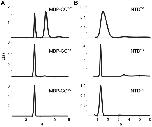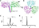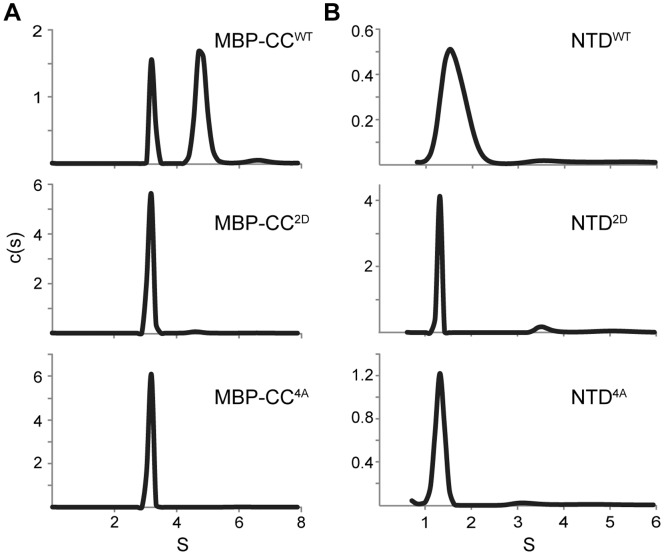Figure 5. Coiled-coil mutations disrupt CC and NTD dimerization.Sedimentation velocity data for MBP-CC95–124 (A) and NTD (B) constructs as wild-type (WT) or containing L104D/L108D (2D) or L104A/L108A/M115A/L118A (4A) mutations. Molecular masses corresponding to each peak are reported in Table S1 in the Supporting Information. |