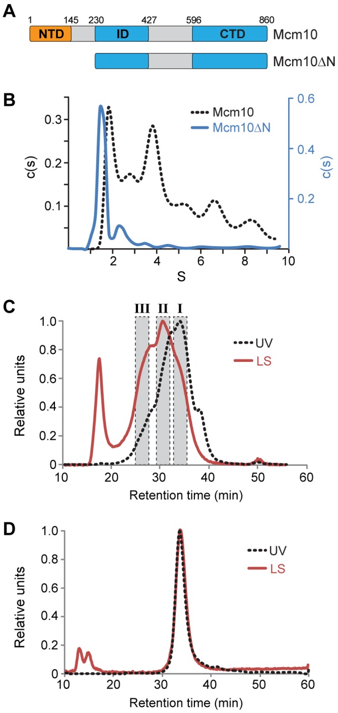 Figure 1. The NTD is necessary for Mcm10 self-association.(A) Schematic of Xenopus laevis Mcm10 constructs used to study self-association. Theoretical molecular masses are 95.4 kDa (Mcm10) and 70.4 kDa (Mcm10ÎN). (B) Sedimentation velocity data for full-length Mcm10 (black dotted line) and Mcm10ÎN (blue) as described in Materials and Methods. The molecular mass of the Mcm10ÎN major peak was calculated to be 68.8 kDa. Molecular masses could not be accurately determined from the full-length data. (C,D) SEC-MALS analysis of Mcm10 (C) and Mcm10ÎN (D). The UV trace is shown as a black dotted line and the light scattering trace is red. (C) Estimated molecular masses were calculated from the three shaded regions to be 90.4 kDa (I), 189.3 kDa (II), and 322.7 kDa (III). The peak at 18 min corresponds to the void volume. (D) The molecular mass of Mcm10ÎN was calculated to be 75.1±0.8 kDa. |