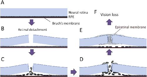 Fig. 1. A process of proliferative vitreoretinopathy, an RPE-mediated retinal disorder in humans. In the intact eye, the neural retina is tightly attached to the RPE lying along Bruch's membrane (A). When the eye suffers from a severe trauma, the neural retina is detached from the RPE and sometimes injured with a tear wound (B). As the RPE cells are exposed to the serum which is leaked from the wound of the neural retina, they leave Bruch's membrane while losing their epithelial characteristics, and migrate toward the vitreous cavity through the tear of the neural retina (C). The migrating RPE cells adhere to both the epi- and subretinal surfaces as well as to the wound surfaces of the neural retina (D), proliferate, and form the epi- and subretinal membranes together with other minor constituent cells including Müller glia-derived cells from the neural retina (E). These RPE-derived cells in the epiretinal membrane exhibit a fibromyocyte-like phenotype. The epiretinal membrane grows and contracts, resulting in the progress of retinal detachment and the loss of vision (F).