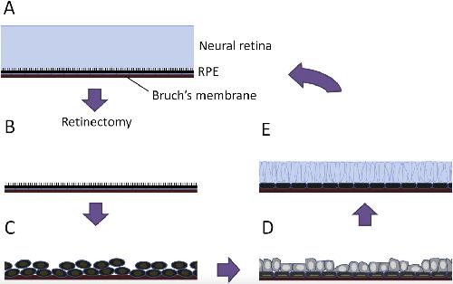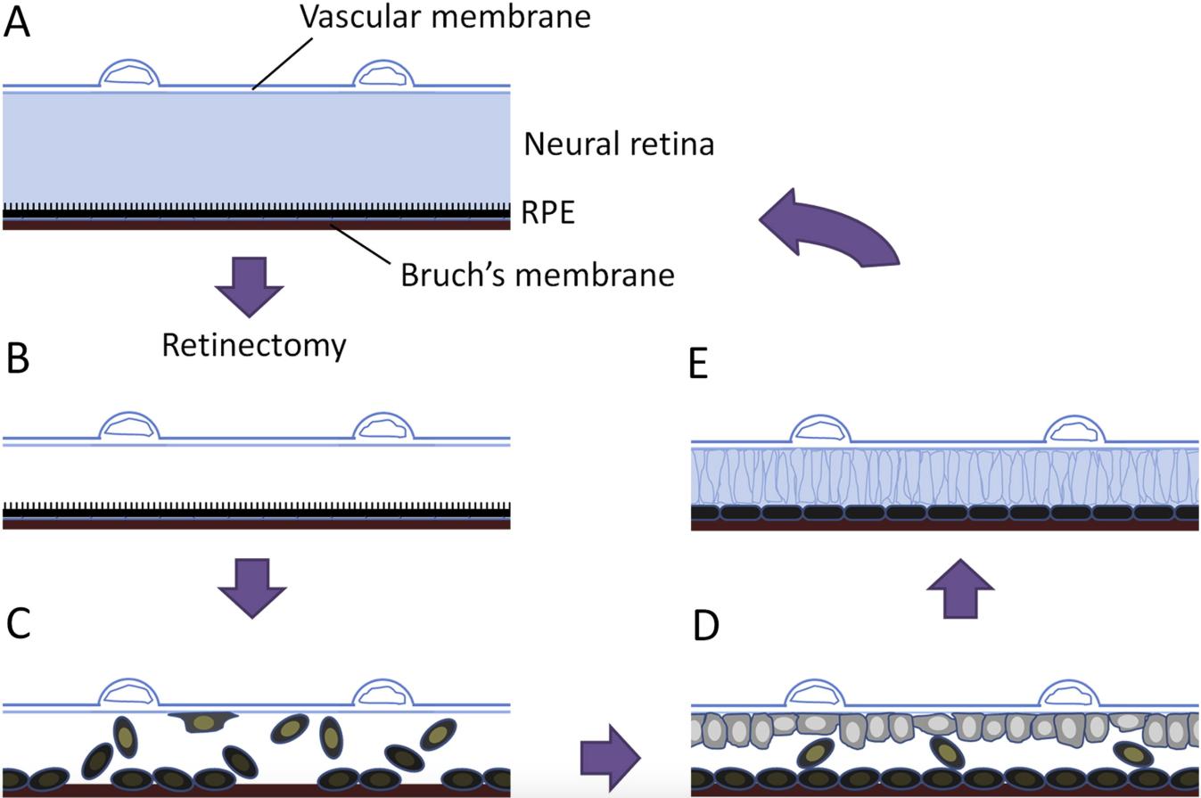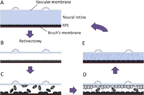 Fig. 2. Retinal regeneration in the adult frog Xenopus laevis. After the neural retina is carefully removed from the eye by surgery (retinectomy) while the RPE and the retinal vascular membrane are remained (A to B), RPE cells are detached from each other, and some of them, that express Pax6, leave Bruch's membrane and migrate toward the retinal vascular membrane (C). RPE cells adhered on the retinal vascular membrane proliferate and regenerate a new neural retina, while those left on Bruch's membrane renew the RPE itself (D, E), and eventually an entire retina with correct polarity is regenerated (EâA).