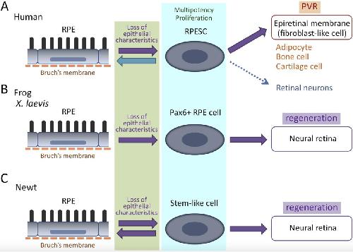 The retinal pigment epithelium (RPE) is a partner of the neural retina and is indispensable for vision. In humans, proliferation and transformation (cell-type switching) of RPE cells after a traumatic injury of the neural retina causes a retinal disorder leading to loss of vision. In contrast, in certain adult amphibians such as Xenopus laevis and the newt, a similar process in RPE cells leads to regeneration of the entire retina. In this review, on the basis of accumulating evidence in basic biology and medical sciences, similarities and differences between these RPE-mediated retinal disorders and regeneration in adult vertebrates are highlighted, providing a connection to future research that should be designed to establish clues for the treatment of pathogenesis caused by RPE while promoting RPE-mediated retinal regeneration in a patient's eyes.