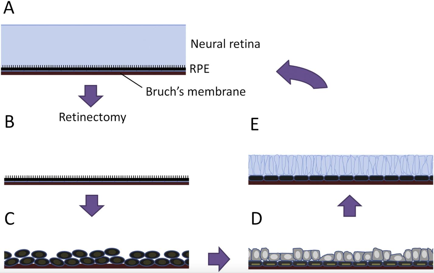 Fig. 3. Retinal regeneration in the adult newt Cynops pyrrhogaster. After the neural retina is carefully removed from the eye by surgery (retinectomy) (A to B), RPE cells are detached from each other and form a layer/aggregates a few cells thick while entering the S-phase of the cell-cycle (Stage-E1) (C). These RPE cells, that are called stem-like cells, are partitioned into two layers (Stage-E2) (D), and then the cells in the inner layer proliferate and regenerate a new neural retina, while those in the outer layer renew the RPE itself (D, E), and eventually an entire retina with correct polarity is regenerated (EâA).