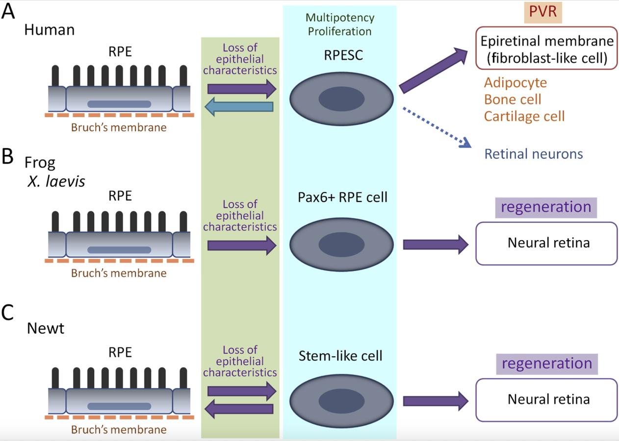 Fig. 4. Behavior of RPE cells after injury of the neural retina in humans (A), adult frog X. laevis (B) and newt (C). In these animals, RPE cells commonly undergo a loss of their epithelial characteristics following a neural retina injury. Through this process RPE cells acquire multipotency and start proliferation. However, the potency of such RPE-derived cells seems to be different between animals. In humans (A), the RPE-derived multipotent cells, called RPE stem cells (RPESCs), can produce, in vitro, mesenchymal cells such as adipocytes, bone cells and cartilage cells, but seem to have a limited potency to differentiate into retinal cells (blue dotted arrow) except for the RPE cell itself (blue arrow), and may differentiate, in proliferative vitreoretinopathy (PVR), into fibroblast-like cells which are a major component of the epiretinal membrane. On the other hand, in adult X. laevis (B), a population of RPE cells acquire multipotency while expressing Pax6 (these cells are called Pax6+ RPE cells), migrate onto the retinal vascular membrane, and eventually transdifferentiate into a neural retina, while remaining RPE cells along Bruch's membrane participate in reforming the RPE. In the adult newt (C), all RPE cells seem to be converted into multipotent cells, called stem-like cells, which eventually generate both a new neural retina and RPE with correct polarity.