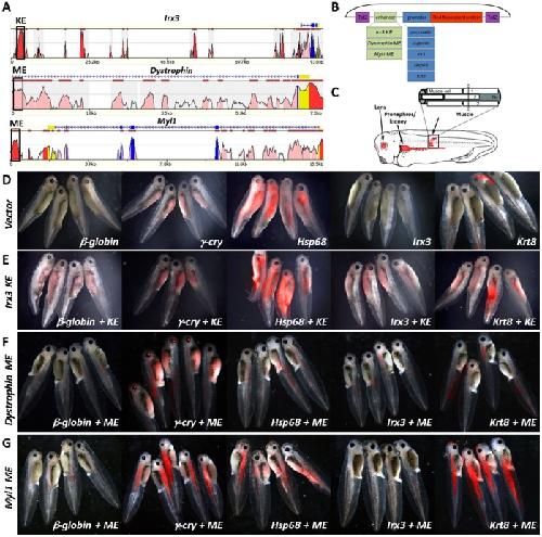Figure 3. Validating computational predictions for muscle enhancers in Xenopus trangenics.Predicted SMEs corresponded to evolutionary conserved elements proximal or distal to genes known to function in skeletal muscle (A-F). Six SMEs consistently expressed in skeletal muscle, in addition to eye (A′–F′). Genomic regions are color coded as follows: exons (blue); UTRs (yellow); repeats (green); conserved noncoding sequences (red); predicted SMEs are shaded in purple.