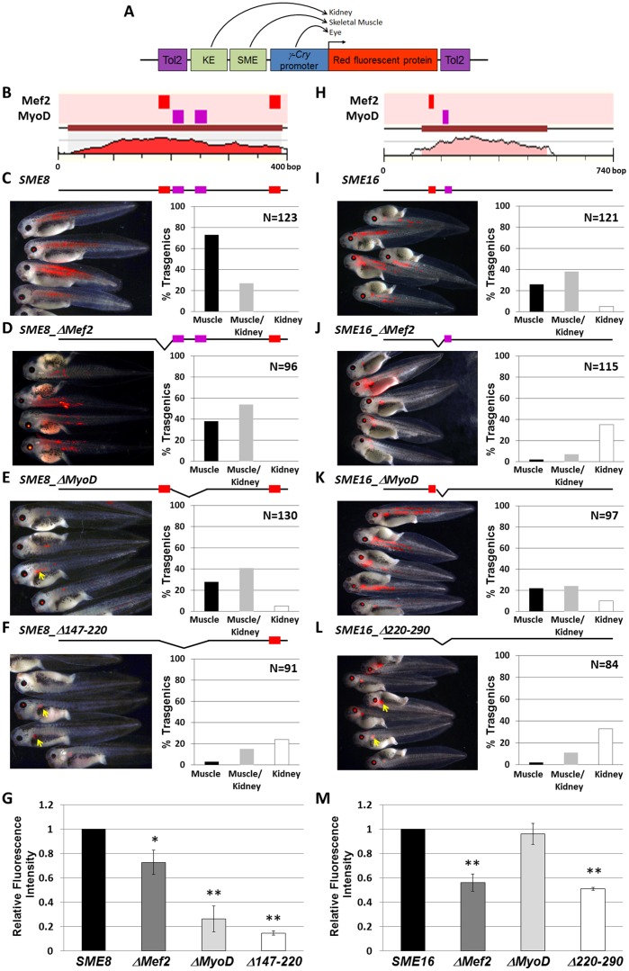 Figure 5. Mef2C/MyoD sites are essential for SME8/16 muscle specific expression.Tol2 constructs containing tandem kidney (KE) and muscle (SME) enhancers in front of γ-cry promoter (A) were systematically mutated to remove the predicted Mef2 and MyoD sites (B, H), and compared to the ‘wildtype’ construct in transgenic efficiency and tissue specificity (C, H), as well as expression intensity (G, M). Mutating either Mef2C or MyoD sites reduced the number of embryos expressing in muscle, as well as reduced the expression intensity (D-F; I-K; G, M). [*p-value <0.05; **p-value <0.001].