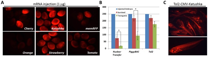 Figure 1. Comparing fluorescent reporter expression and transgenic efficiency in transgenic embryos generated by nuclear transfer, PiggyBAC or Tol2 transgenesis.Six red fluorescent proteins were examined for bright expression in Xenopus oocytes (A). Using the brightest red fluorescent gene, Katushka, constructs with a ubiquitous promoter (CMV) were examined by three methods: nuclear transfer, PiggyBAC transposition and Tol2 transposition. 250 embryos were injected in four independent experiments using CMV-Katushka constructs, and the number of surviving and transgenic embryos were assessed (Table S1); significantly fewer transgenic embryos (p-value <0.005) were generated by nuclear transfer and PiggyBAC, where large numbers of the surviving Tol2 embryos were transgenic (B). Tol2 transgenics were found to give the brightest and most reliable expression in Xenopus (C).