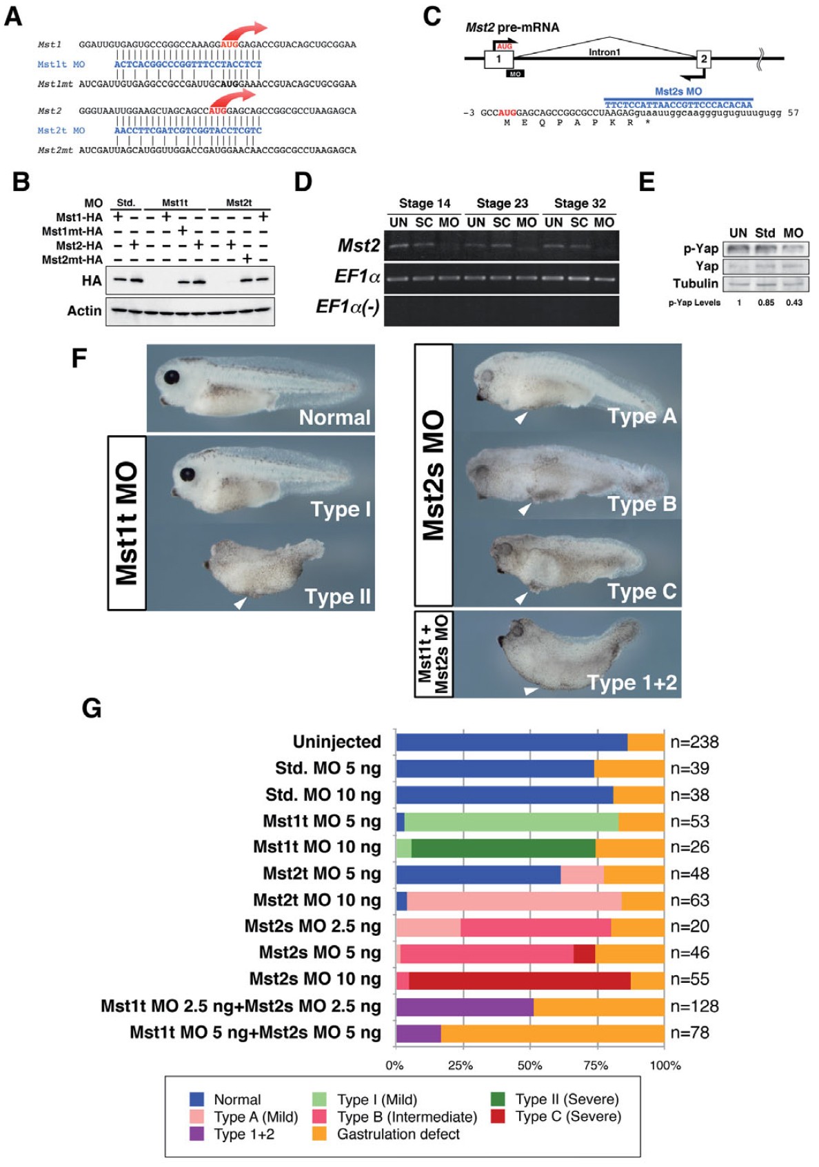 analysis of Mst2 mRNA in MO-injected embryos. Embryos were injected with Mst2 MO (MO, 5 ng) or standard control MO (SC, 5 ng), in the animal pole of both blastomeres at the 2-cell stage, and cultured for RT-PCR until various stages as indicated above each lane. In Mst2 MO-injected embryos, the mature mRNA was not detected from stage 14. Splicing of Mst2 pre-mRNA was not affected by standard control MO injection. UN, uninjected embryo. EF1_ was used as an internal control. EF1_(-), RT-PCR without reverse transcriptase in EF1_ reaction. (E) Western blotting analysis of the Mst1/2 knockdown embryos. Embryos were injected with Mst1t MO and Mst2s MO (MO, Mst1t+2s MO 2.5 ng/2.5 ng) or standard control MO (SC, 5 ng), in the animal pole of both blastomeres at the 2-cell stage, and cultured until stage 30. Phospho-Yap levels were described in the bottom of the panel. UN, uninjected embryo. (F) Phenotypes of Mst morphant. Mst1 or Mst2 MO injection induced a morphological abnormality in a concentration-dependent manner. Discriminations of phenotypes were indicated using the following abbreviations. Mst1 morphant; Type I, short axis. Type II, short axis and abnormal epidermis. Mst2 morphant, Type A; smaller eyes and bent axis. Type B; smaller eyes, bent axis and abnormal epidermis. Type C, smaller eyes abnormal episermis and short axis. Mst1/2 morphant; Type 1+2, short axis and smaller eyes. Arrowheads indicate overgrowth of epidermis. (G) Frequency of observed Mst morphant. Injected MOs are described at the left side of the panel. Numbers of injected embryos are indicated on the right side. Distinctions of phenotypes were indicated using the following colors. blue; Normal, lightgreen;
