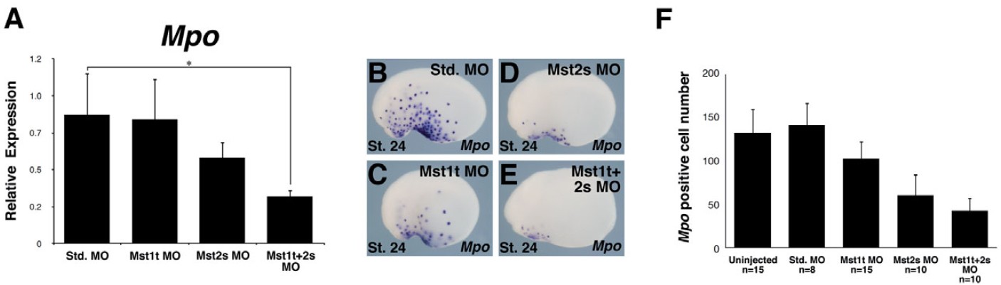 by Mst1/2 MO injection. (F) RT-qPCR analysis revealed that the knockdown of Mst1/2 decreased expression of Mpo, a myeloblast marker. Values represent