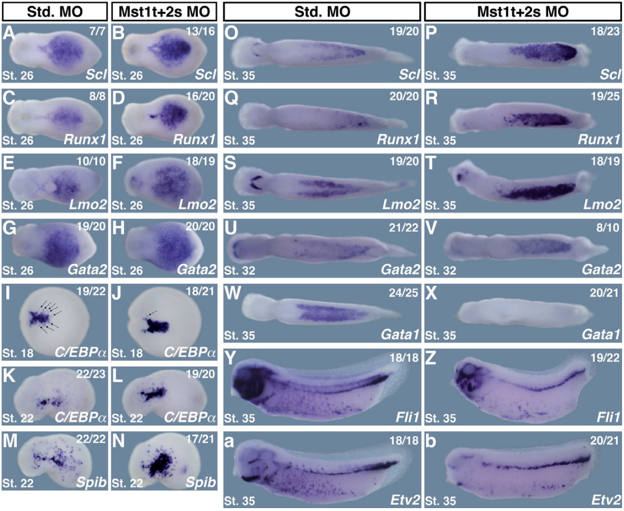 Fig. 6. Effects of Mst1/2 MO injection on hematopoietic and endothelial progenitors. (A-H) At the early stage, no differences in the expression of hematopoietic and endothelial progenitor markers, Scl, Runx1, Lmo2, and Gata2, were observed between standard control MO (Std. MO, 5 ng)- and Mst1/2 MO (Mst1t+2s MO, 2.5/2.5 ng)-injected embryos. (I-N) In the Mst1/2 morphant, expressions of early myeloid progenitor marker, C/EBP_ and Spib were maintained in aVBI, but reduction of migrating differentiated myeloid cells was observed. Arrow indicate migrating myeloid cells from aVBI. (O-V) At the later stage, following the differentiation of hematopoietic cells, Scl, Runx1, Lmo2, and Gata2 expression gradually decreased in the VBI of standard control MO-injected embryos, whereas these markers were continuously expressed at similar levels in the Mst1/2 knockdown embryo. (W,X) The pre-erythroblast marker, Gata1, was markedly decreased by Mst1/2 knockdown. (Y-b) The expression patterns of the endothelial progenitor marker, Fli1 and Etv2, were disrupted by depletion of Mst1/2. Sample numbers are indicated in the upper right of each panel, and developmental stage is indicated in the lower left. Assessed marker is indicated in the lower right of each panel.