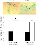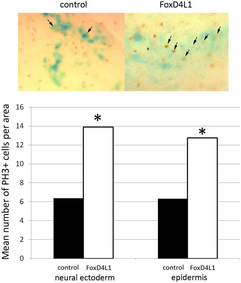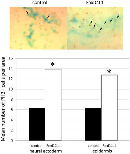 Figure 3. FoxD4L1 increases the number of proliferative cells when expressed in either neural ectoderm or epidermis. Clones of cells, identified by blue cytoplasmic expression of the beta-galactosidase lineage marker, were immunostained for the mitosis marker, phosphorylated histone H3 (PH3). The mean number of labeled cells in the clone (arrows in top panel) was counted. Expression of FoxD4L1 in the clone significantly increased the number of PH3-positive cells over controls (p<0.05; t-test). |