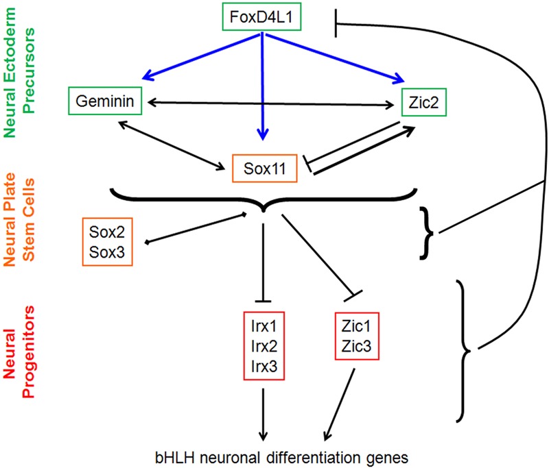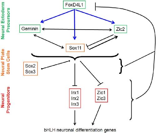 Figure 5. The neural ectoderm gene regulatory network that is active as cells transition from neural ectoderm precursors to neural plate stem cells and then to differentiating neural progenitors. Knock-down experiments demonstrate that FoxD4L1 is required for the expression of the other genes in this network. FoxD4L1 directly up-regulates Geminin, Zic2 and Sox11 (blue arrows). These three genes also regulate each other. Together, the NE precursor genes delay the expression of neural plate stem cell genes (Sox2, Sox3) and down-regulate neural progenitor genes (Zic, Irx), which are required for the expression of the bHLH neuronal differentiation genes. Zic and Irx also feedback to down-regulate FoxD4L1. Arrows depict up-regulation; bars depict down-regulation; diamonds depict delayed expression. |