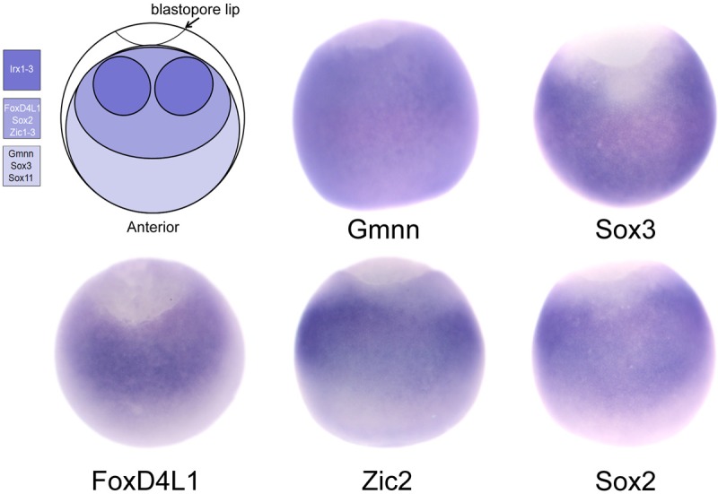 Fugure 1. Several transcription factor expression domains overlap in the newly induced neural ectoderm. Upper left cartoon diagrams the overlapping expression domains of 12 neural transcription factors from a dorsal view in an early gastrulating Xenopus embryo. Similarly oriented embryos show the broad expression domains of Gmnn and Sox3, and the slightly smaller domains of FoxD4L1, Zic2 and Sox2. At this stage of development, the Irx genes are weakly expressed in the same domain as FoxD4L1/Zic/Sox2, with higher expression in lateral patches. |