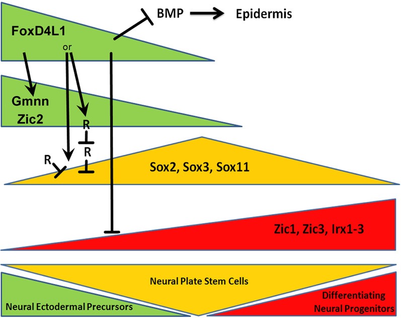 Figure 4. Neural transcription factors can be divided into three groups that act sequentially during the transition from a newly induced neural ectoderm (left side) to the onset of neuronal differentiation (right side). At early stages, neural ectodermal precursors (green) express high levels of FoxD4L1, which directly up-regulates Gmnn and Zic2, transiently down-regulates the Sox neural plate stem cell genes (yellow) directly and/or indirectly, and down-regulates the neural progenitor genes (red). FoxD4L1 also opposes epidermal fate by down-regulating the BMP pathway. As FoxD4L1, Gmnn and Zic2 levels decrease, the neural ectoderm transitions to the neural plate and high levels of Sox gene expression. Finally, as the neural plate stem cells begin to differentiate, neural precursor gene expression predominates. |