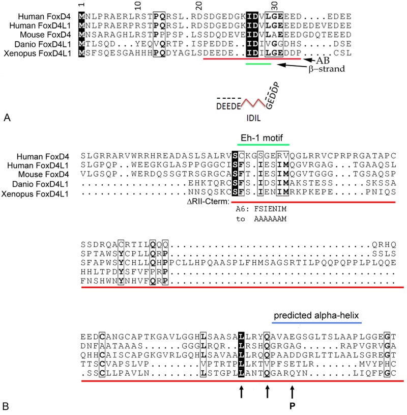 Figure 6. Functional domains of the FoxD4L1 protein are conserved across human, mouse, fish and frog. A: Within the first 40 amino acids in the N-terminus of FoxD4/FoxD4L1 proteins there is an acidic blob (AB) region (red line) that contains a short β-strand (IDIL/IDVL) flanked by negatively-charged (-) acidic amino acids (e.g., D, E). Structure-function studies carried out in Xenopus embryos show that this region is responsible for the transcriptional activation activity of FoxD4L1, and that a glycine residue (G) downstream of the β-strand is required for flexibility in the protein to bring the two acidic domains in proximity. B: Within the C-terminal region of the FoxD4/FoxD4L1 proteins is a conserved Eh-1 motif (green bar), which binds the Groucho/Grg transcriptional repressor co-factor, and a conserved region that is predicted to form an α-helical structure (blue bar). Deletion of the entire region (ΔRII-Cterm; red bar) eliminates the transcriptional repressive activity of FoxD4L1. Mutation of the Eh-1 motif (called A6) that changes the sequence from FSIENIM to AAAAAAM prevents Grg binding and reduces repression. In addition, mutation of a single amino acid predicted to break the α-helix (P to Q) reduces repression. These experiments indicate that both Grg binding and the α-helical structure are required for full repressive activity of the protein. Arrows at conserved L and Q indicate control mutations near the α-helix that had no effect on repressive function of the protein. |