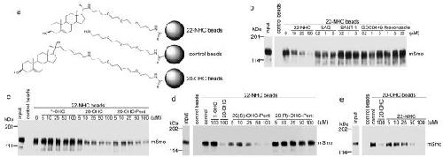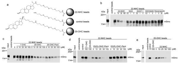 Figure 2. 22-NHC binds Smo at the oxysterol-binding site(a) Schematic of 22-NHC and 20-OHC affinity matrices. 22-NHC and 20-OHC are covalently attached to agarose beads via a polyethylene glycol (PEG) linker. Control beads carry only the PEG linker.(b) 22-NHC beads were incubated with detergent extracts of 293T cells expressing mSmo-Cherry, in the presence of the indicated concentrations of competitor compounds. The beads were washed and bound protein was eluted, separated by SDS-PAGE and immunoblotted with anti-Cherry antibodies. A portion of the extract was analyzed in parallel, to show input. MSmo binds specifically to 22-NHC beads, and binding is not competed by other Smo inhibitors.(c) As in (b) but with the addition of the inactive oxysterol 7-OHC, or the active oxysterols, 20-OHC and 20-OHC-Pent. Binding of mSmo to 22-NHC beads is competed in a dose-dependent manner by 20-OHC and 20-OHC-Pent, but not by 7-OHC.(d) As in (b) but with the addition of 20(S)-OHC-Pent and 20(R)-OHC-Pent. Binding of mSmo to 22-NHC beads is competed by the active S diastereomer but not by the inactive R diastereomer.(e) As in (b) but using 20-OHC beads, in the presence of free 22-NHC or 20-OHC. Binding of mSmo to 20-OHC beads is competed in a dose-dependent manner by free 22-NHC and 20-OHC.The full immunoblots for this figure are shown in Supplementary figure 11.