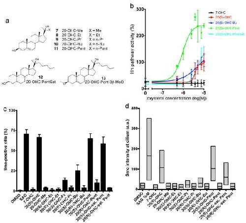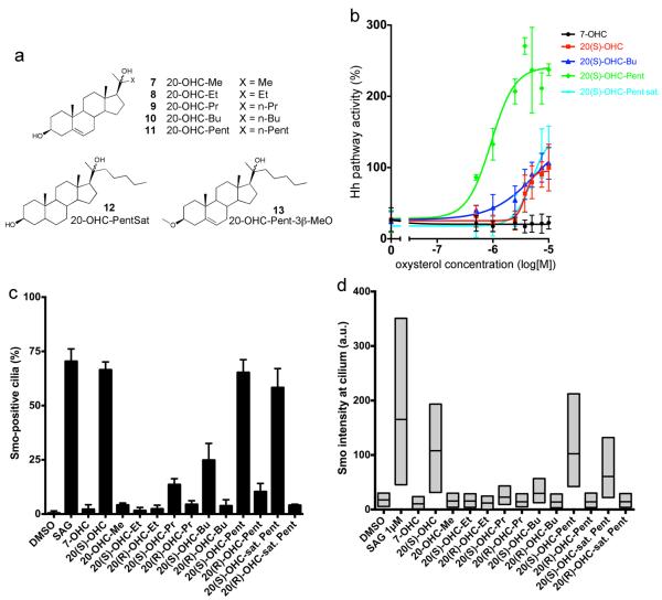 Figure 4. Structural requirements for oxysterol activation of Smo(a) Structures of 20-OHC analogs used in this study (compounds 7–13). All analogs except 20-OHC-Me (7) have a C-20 stereocenter, and pure S and R diastereomers were isolated and assayed separately.(b) Shh Light II cells were treated with varying concentrations of the oxysterols 20(S)-OHC, 20(S)-OHC-Pent, 20(S)-OHC-PentSat and 20(S)-OHC-Bu, followed by measuring Hh pathway activity by luciferase assay. The inactive oxysterol, 7-OHC, was used as negative control. Error bars represent standard deviation (n=4 independent experiments).(c) NIH-3T3 cells were incubated overnight with the indicated oxysterols (10 μM). Cells were then fixed and processed for immunofluorescence with rabbit anti-Smo antibodies (to detect endogenous Smo) and mouse anti-acetylated tubulin antibodies (to visualize primary cilia). SAG (1 μM) and 7-OHC (10 μM) were used as positive and negative control, respectively. The graph shows the percentage of Smo-positive cilia. At least 150 cilia were analyzed per condition. Error bars represent the sub-sampling standard deviation of the fraction of positive cilia (see Online Methods).(d) As in (c), but with box plots showing the fluorescence intensity of endogenous Smo at cilia. For each condition, the Smo signal was normalized to the intensity of the 20(S)-OHC treatment. The lower and upper bounds of each box represent the 25th and 75th percentile of the distribution of Smo intensity at cilia, while the horizontal line represents the median intensity across the entire population of cilia.