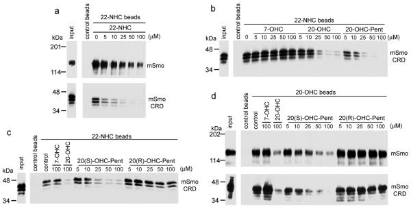 Figure 3. Oxysterols and 22-NHC bind the extracellular cysteine-rich domain (CRD) of vertebrate Smo(a) Secreted HA-tagged mSmoCRD and detergent extracts of 293T cells expressing mSmo-Cherry were tested for binding to 22-NHC beads, in the presence of free 22-NHC. MSmoCRD binds 22-NHC beads, similar to mSmo.(b) MSmoCRD binding to 22-NHC beads was assayed as in (a), in the presence of 7-OHC, 20-OHC or 20-OHC-Pent. Only the active sterols 20-OHC and 20-OHC-Pent compete mSmoCRD binding to 22-NHC beads, while the inactive 7-OHC does not.(c) As in (b) but in the presence of the diastereomers 20(S)-OHC-Pent and 20(R)-OHC-Pent. Only the active S diastereomer competes mSmoCRD binding to 22-NHC beads.(d) MSmoCRD and mSmo binding to 20-OHC beads was assayed as in (c). Both mSmoCRD and mSmo bind 20-OHC beads and are competed by 20(S)-OHC-Pent, but not 20(R)-OHC-Pent. The binding affinities of mSmoCRD and mSmo to 20-OHC beads are similar.The full immunoblots for this figure are shown in Supplementary figure 11.