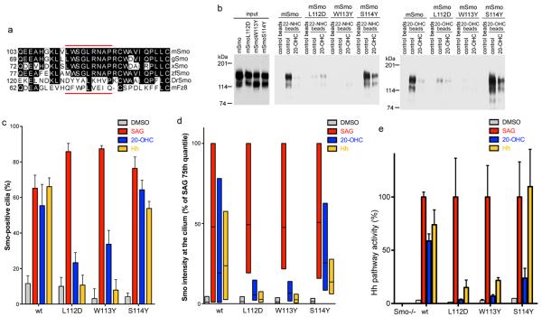 Figure 5. Oxysterol binding to Smo is required for high level Hh signaling(a) Alignment of a portion of CRDs of mouse Smo (mSmo), chicken Smo (gSmo), Xenopus Smo (xSmo), zebrafish Smo (zfSmo), Drosophila Smo (DrSmo) and mouse Fz8 (mFz8). The stretch indicated with red lines contains 5 residues that, in mFz8, contact the Xwnt8 palmityl moiety (Q71, F72, P74, L75 and I78).(b) Cherry-tagged mSmo, mSmoL112D, mSmoW113Y or mSmoS114Y were tested for binding to 22-NHC and 20-OHC beads, in the presence or absence of 20-OHC (100 μM). MSmoL112D and mSmoW113Y do not bind 22-NHC and 20-OHC beads. The full immunoblot is shown in Supplementary figure 11.(c) Smo−/− MEFs rescued with mSmo, mSmoL112D, mSmoW113Y or mSmoS114Y were incubated overnight with DMSO control, SAG (1 μM), 20-OHC (10 μM) or Shh. The graph shows the percentage of Smo-positive cilia. Error bars represent the sub-sampling standard deviation of the fraction of positive cilia (see Online Methods). Between 131–207 cilia were analyzed per condition. MSmoL112D and mSmoW113Y have a defective response to 20-OHC and Shh.(d) As in (c), but with box plots showing Smo fluorescence intensity at cilia. For each condition, the Smo signal was normalized to the intensity of the SAG treatment for the respective cell line.(e) As in (c), but cells were processed for Q-PCR, to measure Gli1 transcription. For each treatment, Gli1 levels were normalized to the level induced by SAG in the respective cell line. Error bars show standard deviation (n=3 independent experiments). MSmoL112D and mSmoW113Y do not respond to 20-OHC and have a reduced responsiveness to Shh.