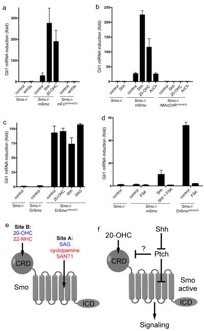 Figure 6. Conserved and divergent aspects of Smo signaling(a) Smo−/− MEFs, stably expressing mSmo or the cilia-localized chimera mFz7mSmoICD were incubated with control media, 20-OHC (10 μM), Shh, or wnt3a. The cells were processed for Q-PCR, to measure Gli1 transcription. Error bars show standard deviation (n=3 independent experiments). MFz7mSmoICD did not rescue Hh signaling in Smo−/− cells, irrespective of the presence of Wnt3a.(b) As in (a), but with stable expression of the chimera rMAcChRmSmoICD, which is recruited to cilia by treatment with acetylcholine (AcCh, 100 μM). RMAcChRmSmoICDdoes not rescue Hh signaling, in the presence or absence of AcCh.(c) As in (a) but with stable expression of low levels of DrSmomSmoICD. DrSmomSmoICD is constitutively active, and is not further activated by 20-OHC (10 μM), Shh, or SAG (400 nM). In contrast, DrSmo is inactive in Smo−/− MEFs.(d) As in (c), but with addition of 20 μM forskolin (FSK), to block Hh signaling downstream of Smo. Signaling by both mSmo and DrSmomSmoICD is blocked by FSK.(e) Schematic of the mSmo protein and of the location of Sites A and B. For each site, activators are in blue, while inhibitors are in red.(f) Regulation of vertebrate Smo. Inhibition of Ptch by Shh results in Smo Site A activation; it is unclear if Site B is also activated by Shh. The oxysterol 20-OHC, which binds to Site B in the extracellular domain of Smo, potentiates Site A activation. Active Smo then signals to the cytoplasm.