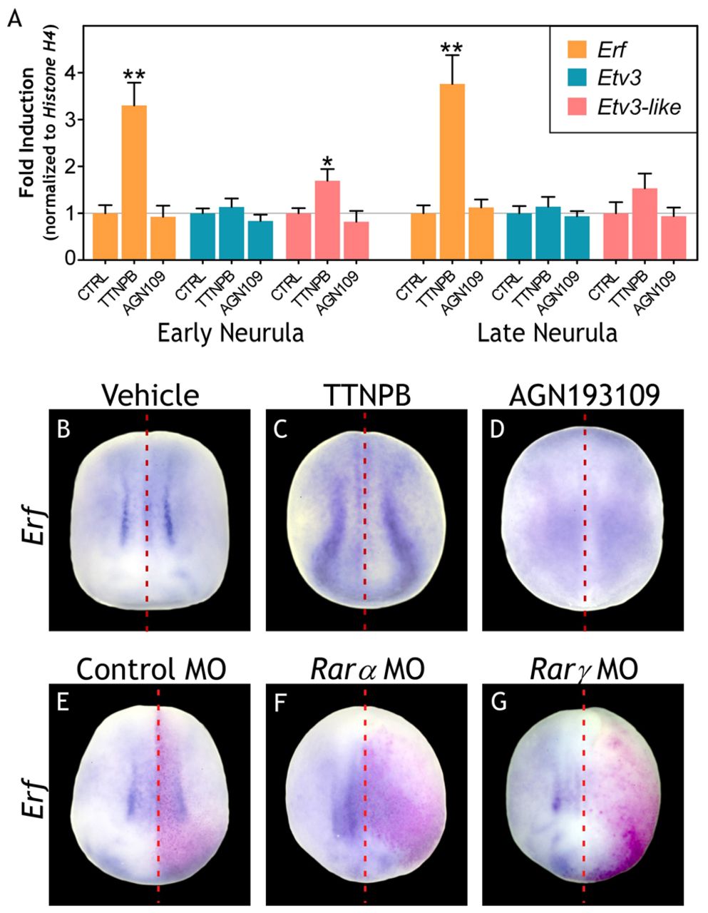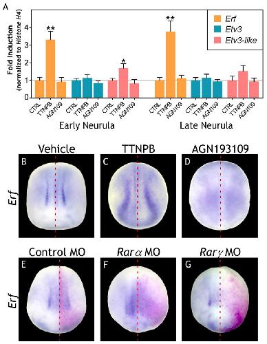 RAR signaling modulates Erf and Etv3l expression. (A) QPCR showing Erf, Etv3 and Etv3l expression in embryos treated at stage 7/8 with 1 μM TTNPB, 1 μM AGN193109 or vehicle (0.1% ethanol). The y-axis represents 2-δδCt values normalized to Histone H4 and expressed as fold induction relative to control. Erf is induced by TTNPB, Etv3l is induced by TTNPB in early neurula, whereas Etv3 is not. Asterisks represent statistical significance compared with control (*=Pâ¤0.05, **=Pâ¤0.01). (B-D) Whole-mount in situ hybridization of Erf expression from whole embryos treated at stage 7/8 with 1 μM TTNPB, 1 μM AGN193109 or vehicle (0.1% ethanol). Expansion of Erf was observed in 13/13 of TTNPB-treated embryos; blurring of Erf expression in the neural folds was observed in 13/13 of AGN193109-treated embryos. (E-G) Embryos were injected unilaterally at the two- or four-cell stage. The injected side is indicated by the magenta lineage tracer. (E) Control expression of Erf. (F) 3.3 ng Rarα1 MO + 3.3 ng Rarα2.1 MO + 3.3 ng Rarα2.2 MO reduced expression of Erf (10/10). (G) 3.75 ng Rarγ1 MO + 3.75 Rarγ2 MO reduced expression of Erf (11/11). Embryos are shown in dorsal view at stage 14; anterior is at the bottom.
