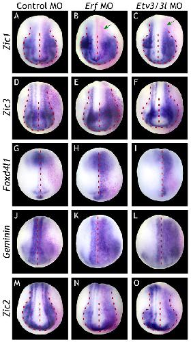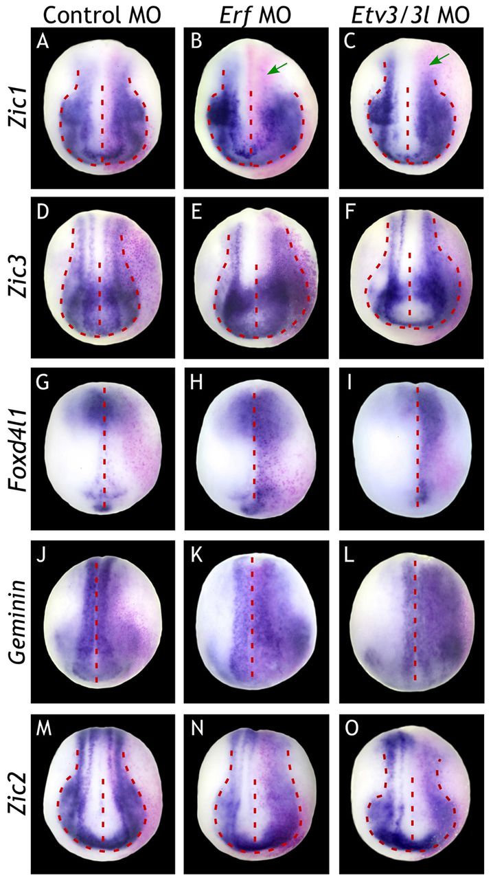 ERF or ETV3/3L knockdown expands expression of Zic1, Zic2, Zic3, Geminin and Foxd4l1 in the anterior/dorsal region. Embryos were injected unilaterally at the two- or four-cell stage. The injected side is indicated by the magenta lineage tracer. (A,D,G,J,M) Control expression of Zic1, Zic2, Zic3, Geminin and Foxd4l1. (B,E,H,K,N) Embryos injected with 10 ng Erf MO showed lateral expansion (13/14) and posterior reduction (13/14, green arrow) of Zic1; stripe blurring (23/23) and posterior reduction (10/23) of Zic2; stripe blurring (14/21) and posterior reduction (6/21) of Zic3; and expansion of Foxd4l1 (10/16) and Geminin (16/22). (C,F,I,L,O) Embryos injected with 20 ng Etv3/3l MO showed lateral expansion (12/15) and posterior reduction (12/15, green arrow) of Zic1; stripe blurring (14/14), lateral expansion (5/14) and posterior reduction (10/14) of Zic2; stripe blurring (14/14), lateral expansion (18/21) and posterior reduction (8/21) of Zic3; and expansion of Foxd4l1 (16/20) and Geminin (16/16). Embryos are shown in dorsal view at stage 14; anterior is at the bottom.