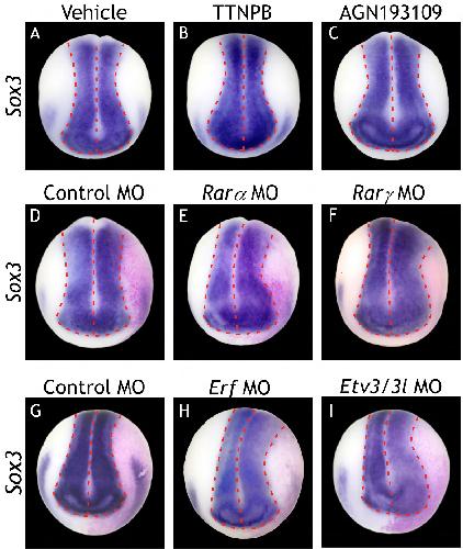 3.75 Rarγ2 MO expanded expression of Sox3 (21/22). (H,I) 10 ng Erf MO expanded Sox3 expression (8/14) and 20 ng Etv3/3l MO