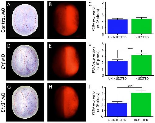 P=0.776). (D-F) Embryos injected with 10 ng Erf MO showed an increased number of PCNA nuclei on the injected side (n=45;