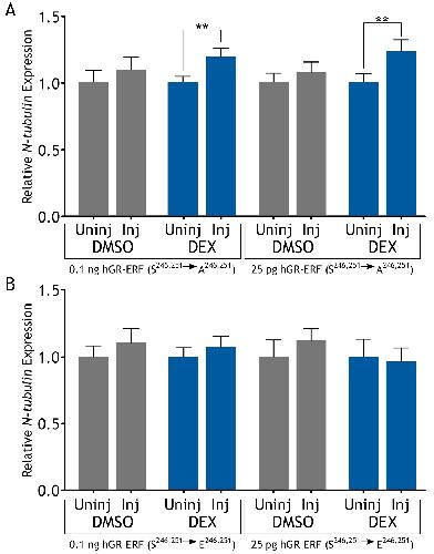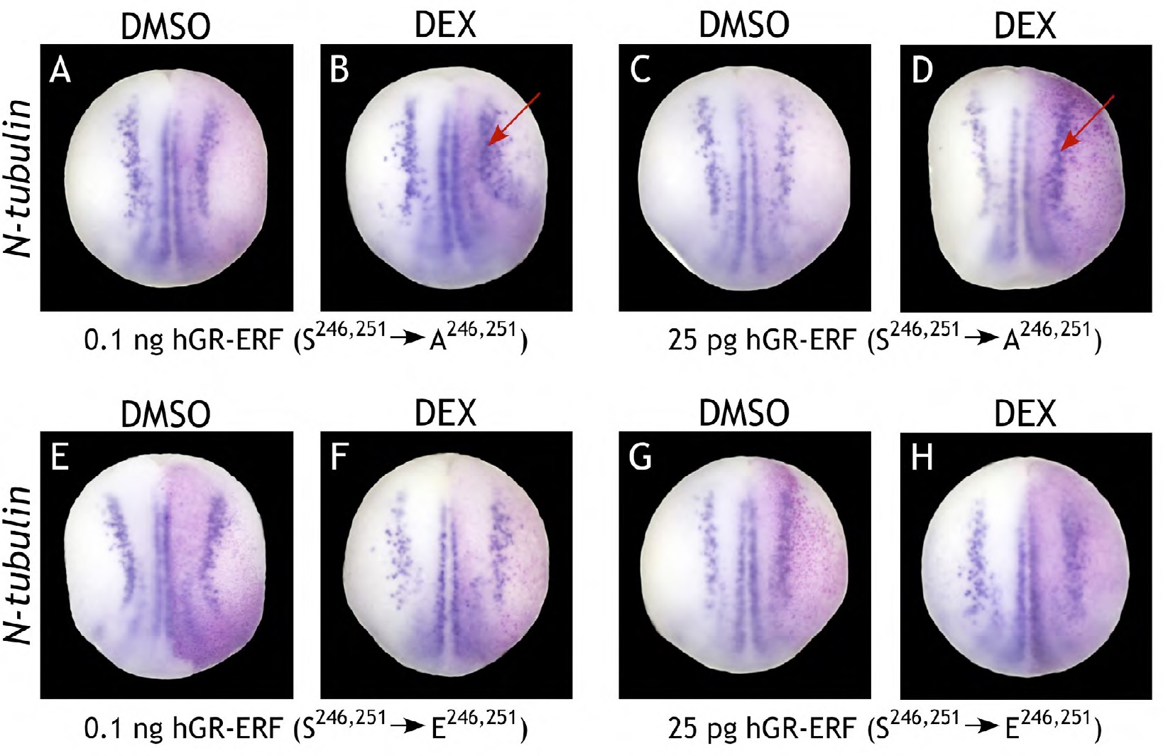 injected with 25 pg hGR-Erf (S246,251âE246,251) mRNA. The red arrows indicate the increase in N-tubulin expression. All embryos are