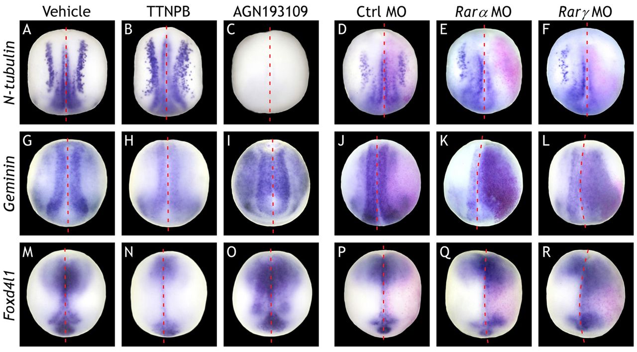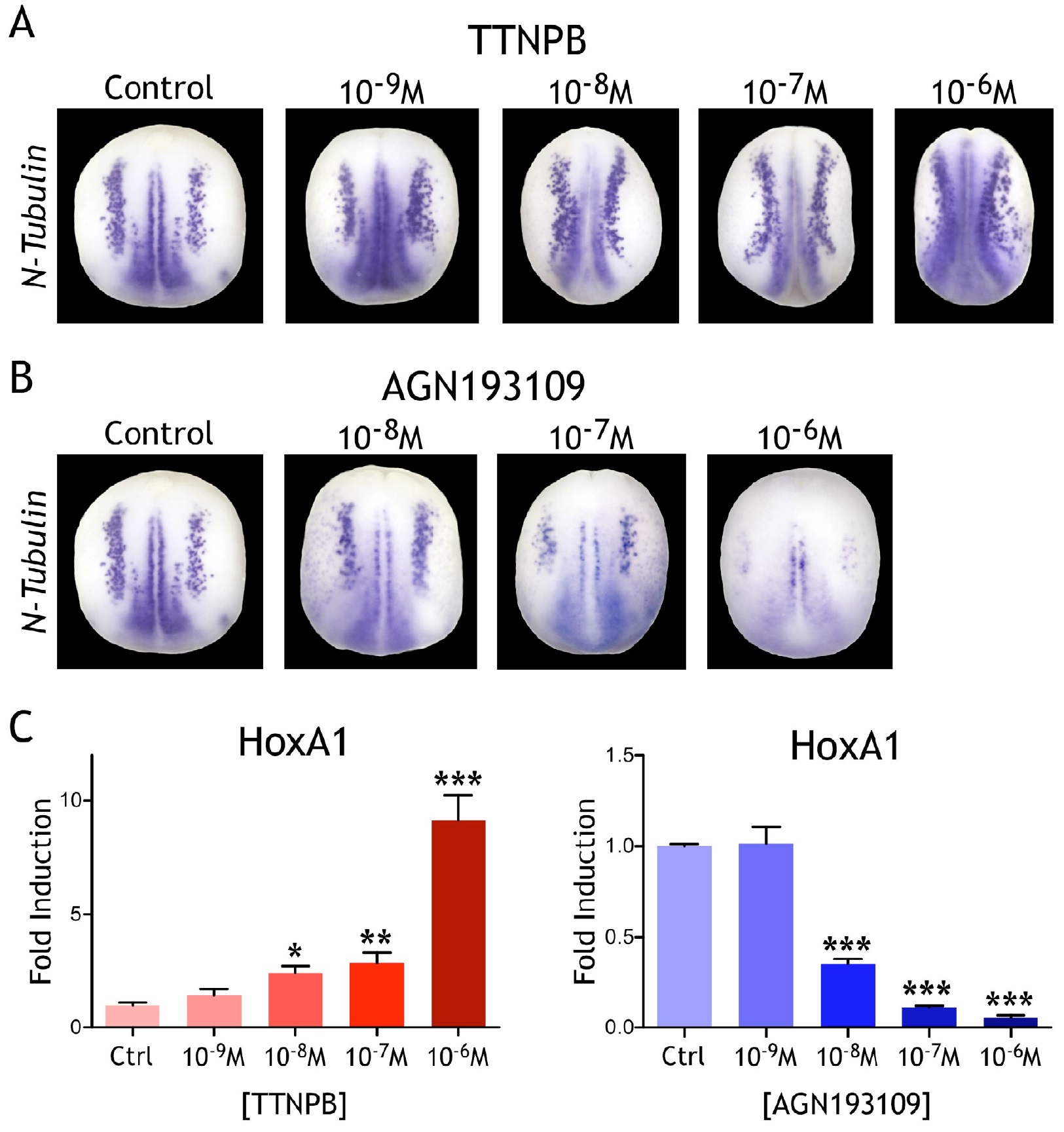 stage 7/8 with 1 nM to 1 μM TTNPB, 10 nM to 1 μM AGN193109 or control vehicle (0.1% ethanol). Dorsal N-tubulin expression is