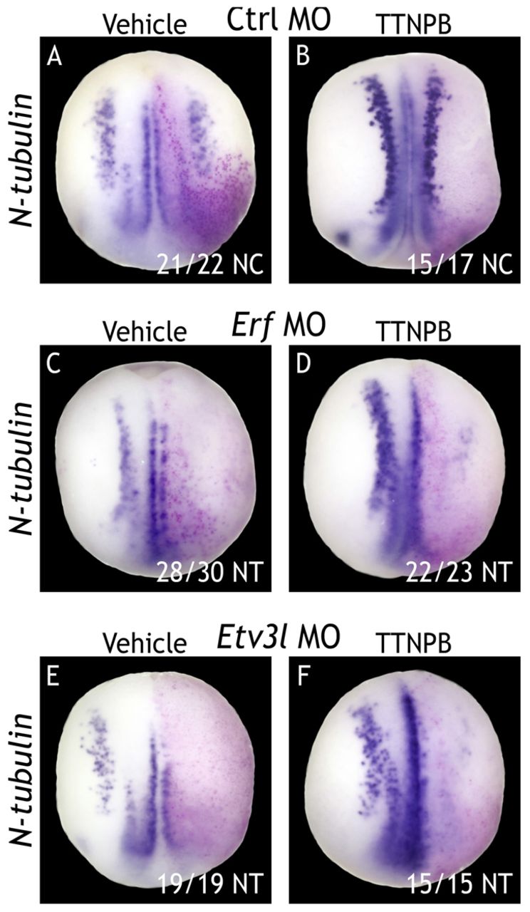 ERF or ETV3L knockdown rescues the extra/ectopic neuron phenotype generated by TTNPB. All embryos were injected unilaterally at the two- or four-cell stage. The injected side is indicated by the magenta β-gal mRNA lineage tracer. Embryos were treated at stage 7/8 with TTNPB or control vehicle (0.1% ethanol). (A,B) 10 ng control MO does not change expression of N-tubulin (NC, no change). (C,D) 10 ng Erf MO rescues (96%) the TTNPB extra/ectopic neuron phenotype (NT, no tubulin). (E,F) 20 ng Etv3l MO completely rescues (100%) the TTNPB phenotype. Embryos are shown in dorsal view with anterior at the bottom, at stage 14.