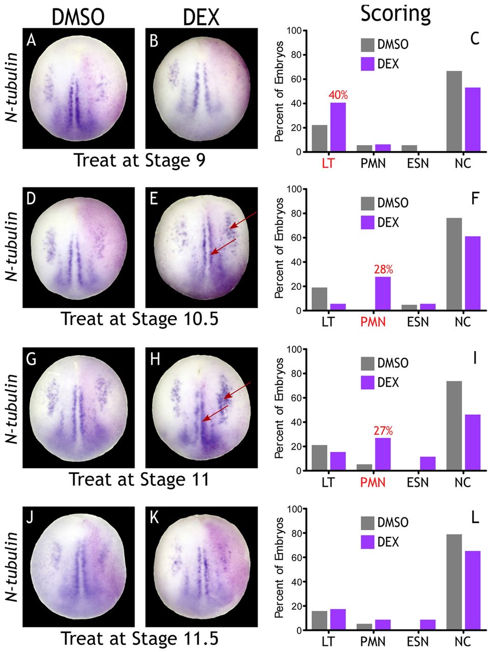with 10 μM dexamethasone (DEX) or 0.1% DMSO vehicle at stage 11. Quantitation of N-tubulin expression at stage 14 is shown.