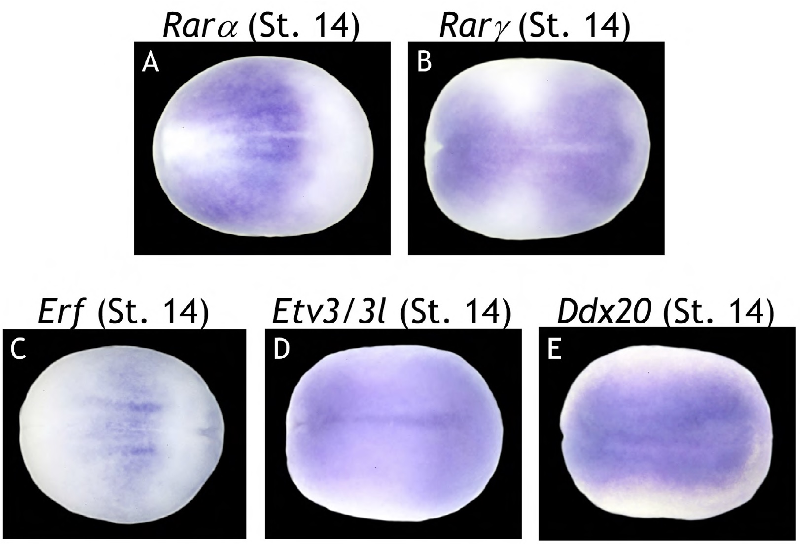 Rarα (A), Rarγ (B), Erf (C), Etv3/3l (D) and Ddx20 (E) gene expression at Nieuwkoop and Faber stage 14. Dorsal views are shown