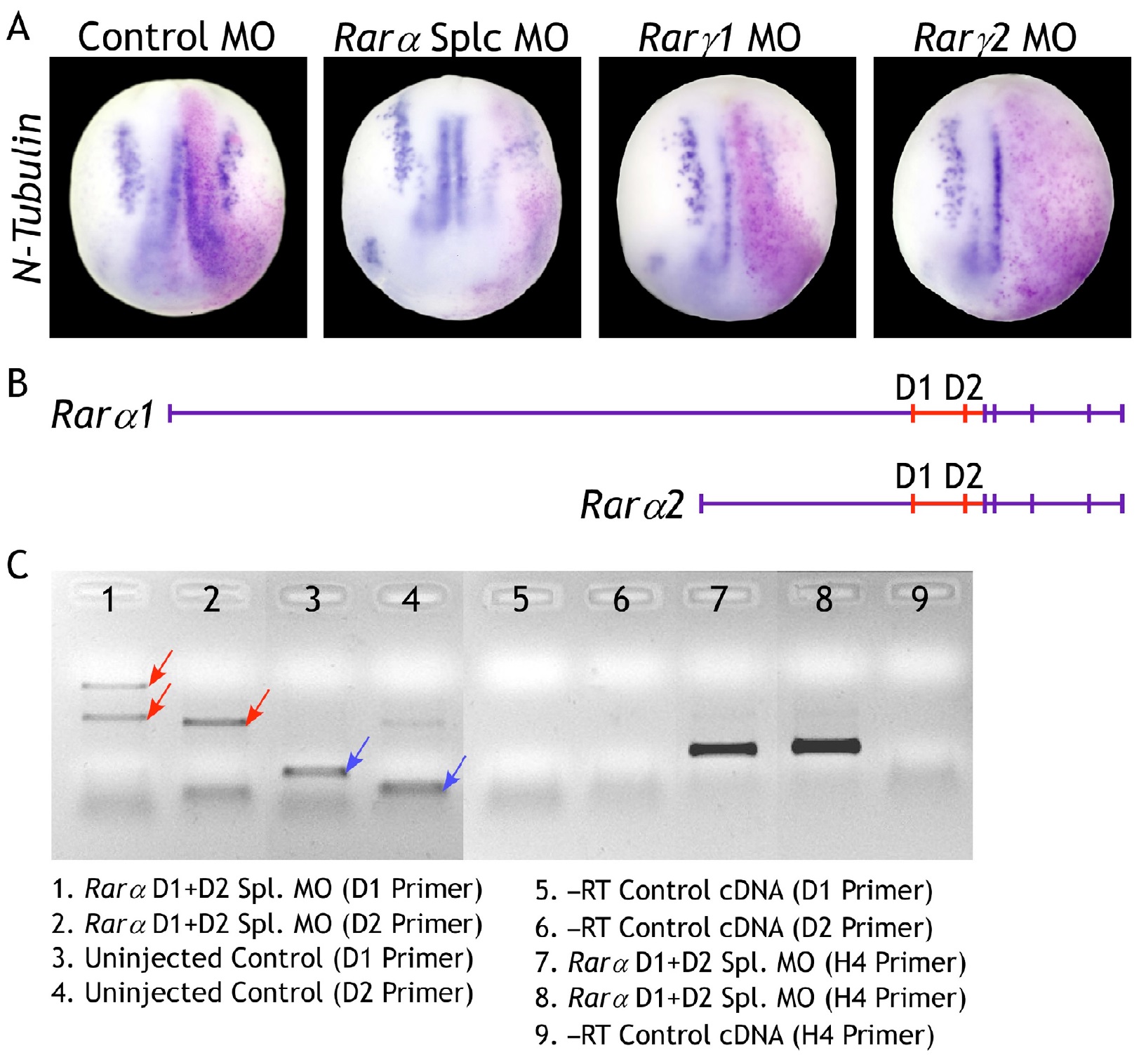 the two Rarα splice MOs. The splice MOs target both Rarα1 and Rarα2. (C) PCR and gel electrophoresis of cDNA from uninjected