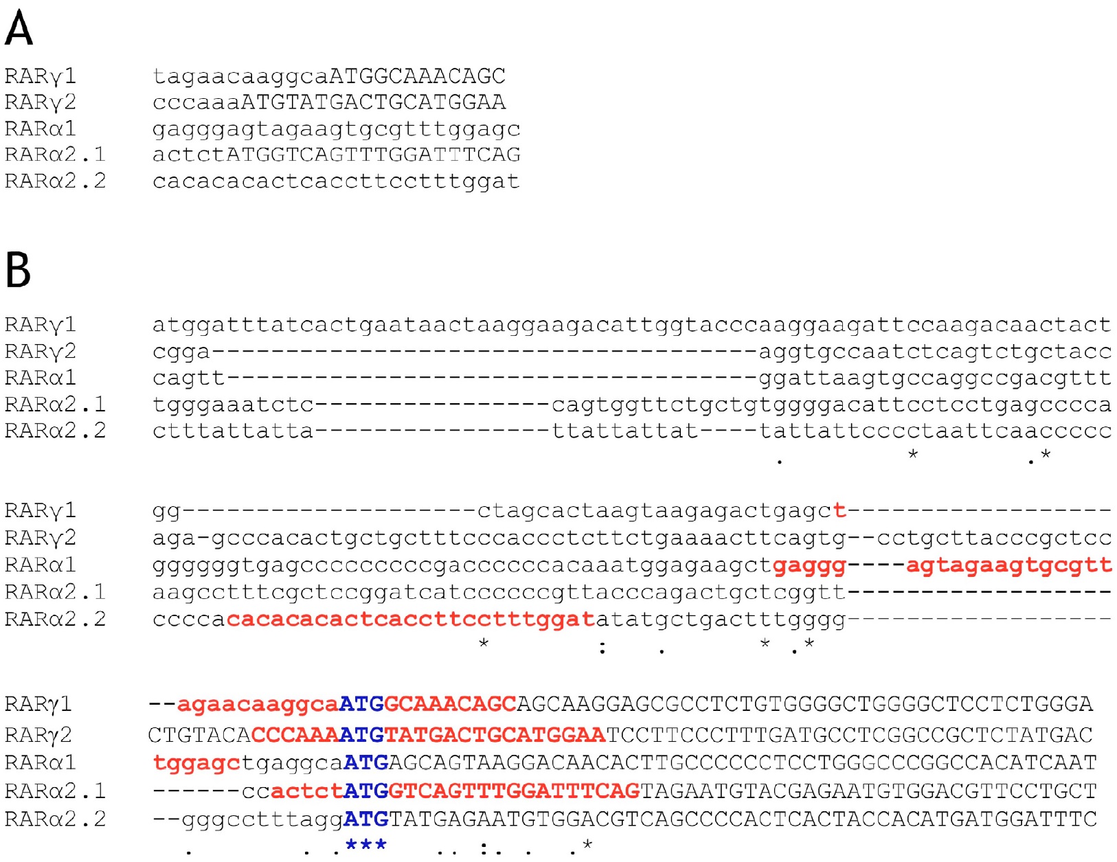 capitals. (B) MAFFT alignment of relevant regions of the 5’UTR and variable 5’ coding of RAR isoforms in Xenopus laevis,