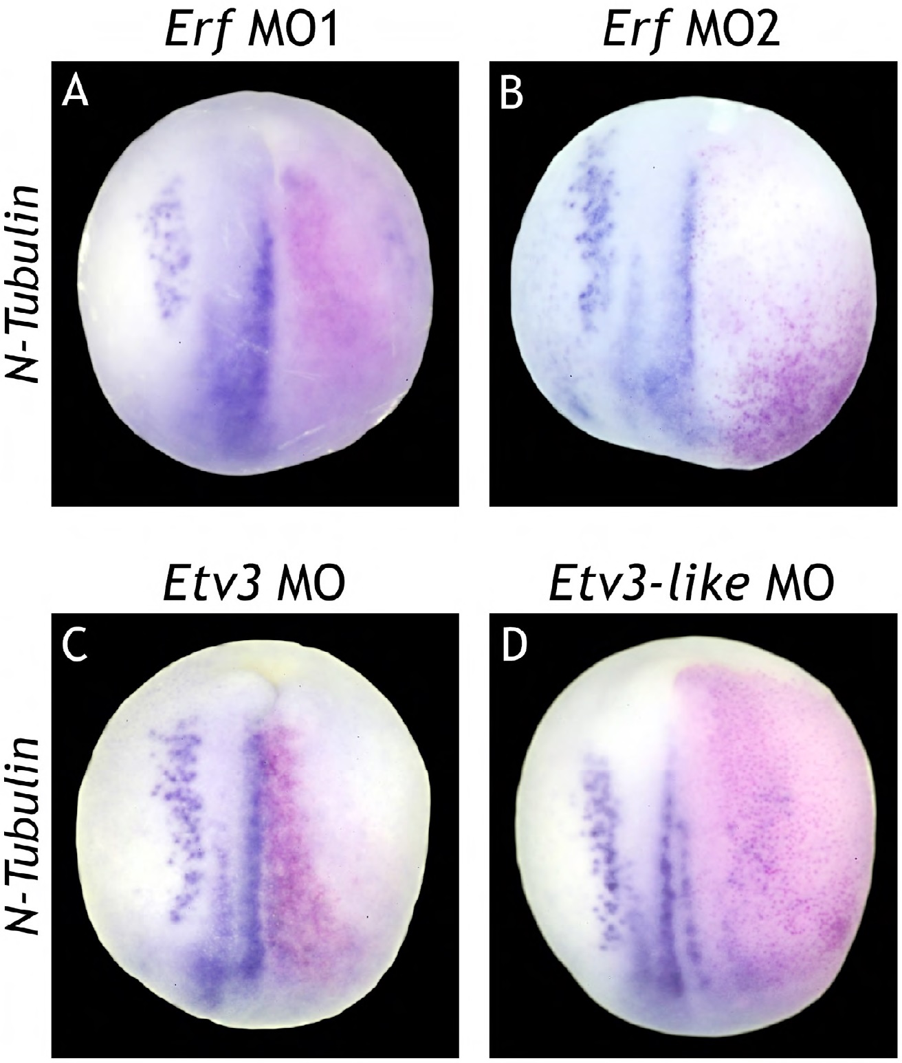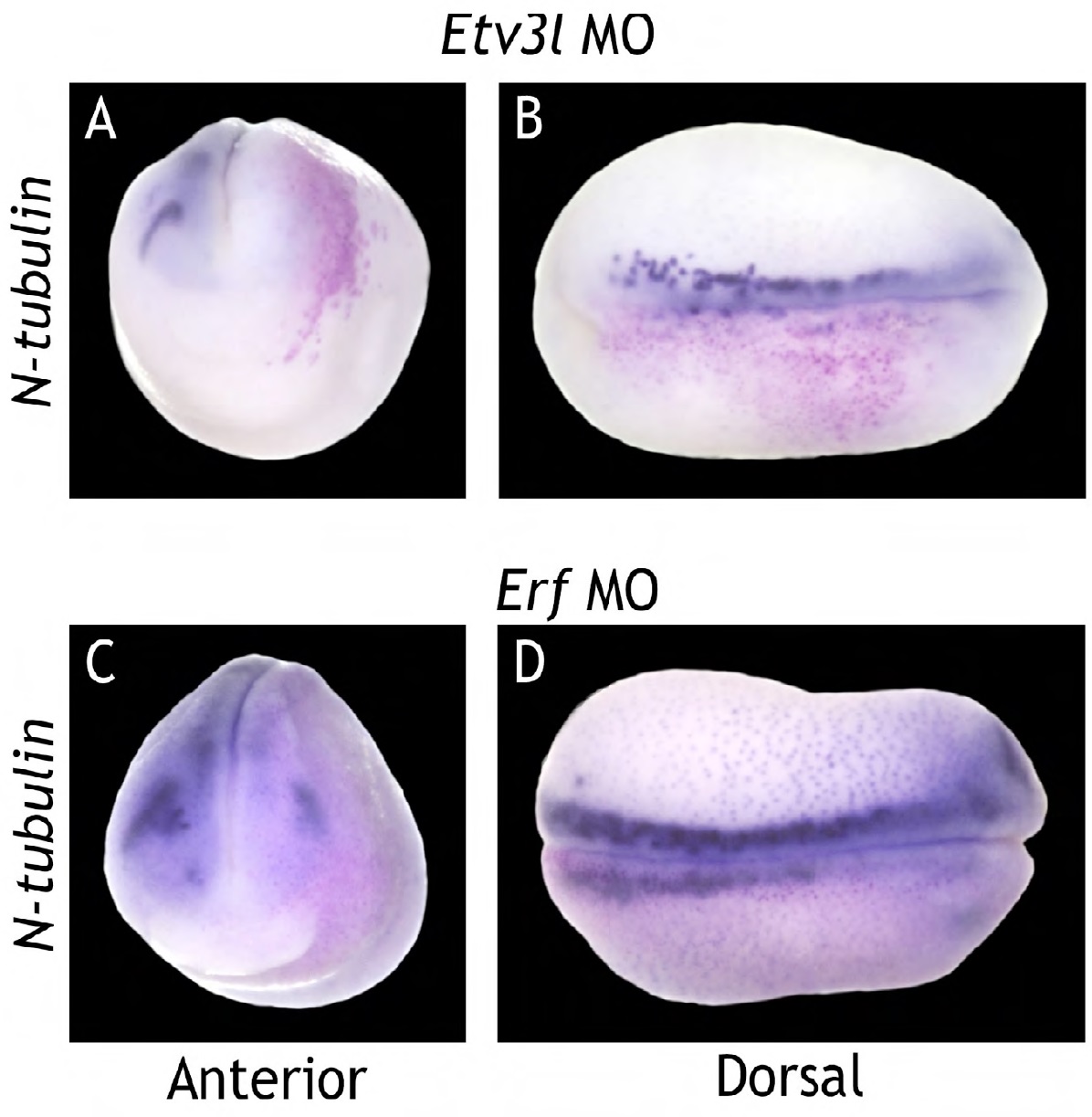 (C) and dorsal (D) views of 10 ng Erf MO, which resulted in decreased N-tubulin expression at stage 22 (16/32 embryos).