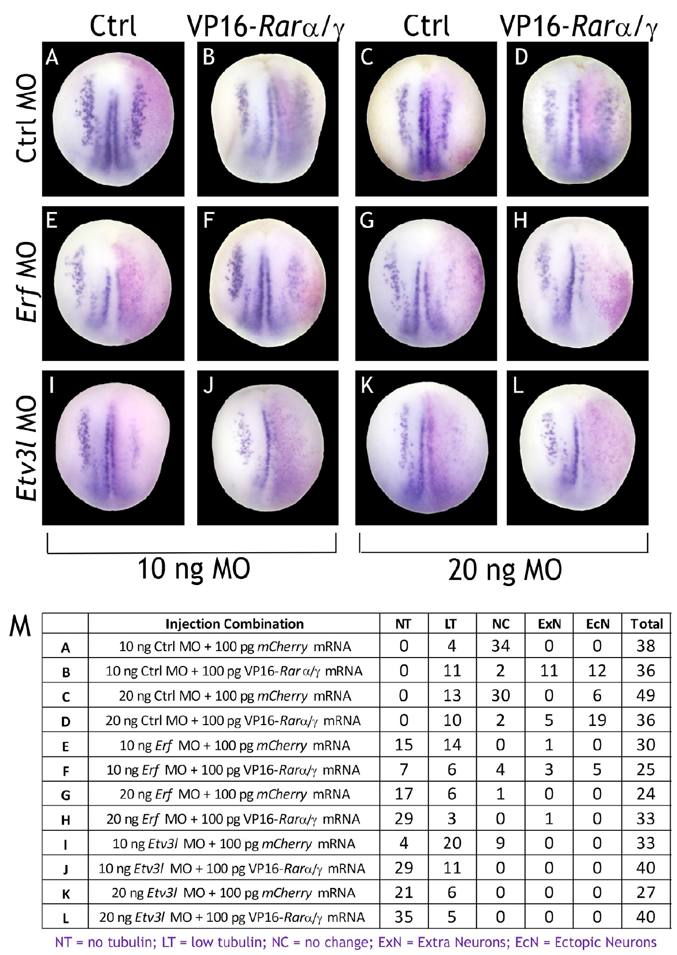 and 20 ng Erf MO completely rescues (97%) VP16-Rarα/γ mRNA extra/ectopic neuron phenotype. (I-L) 10 ng or 20 ng Etv3l MO