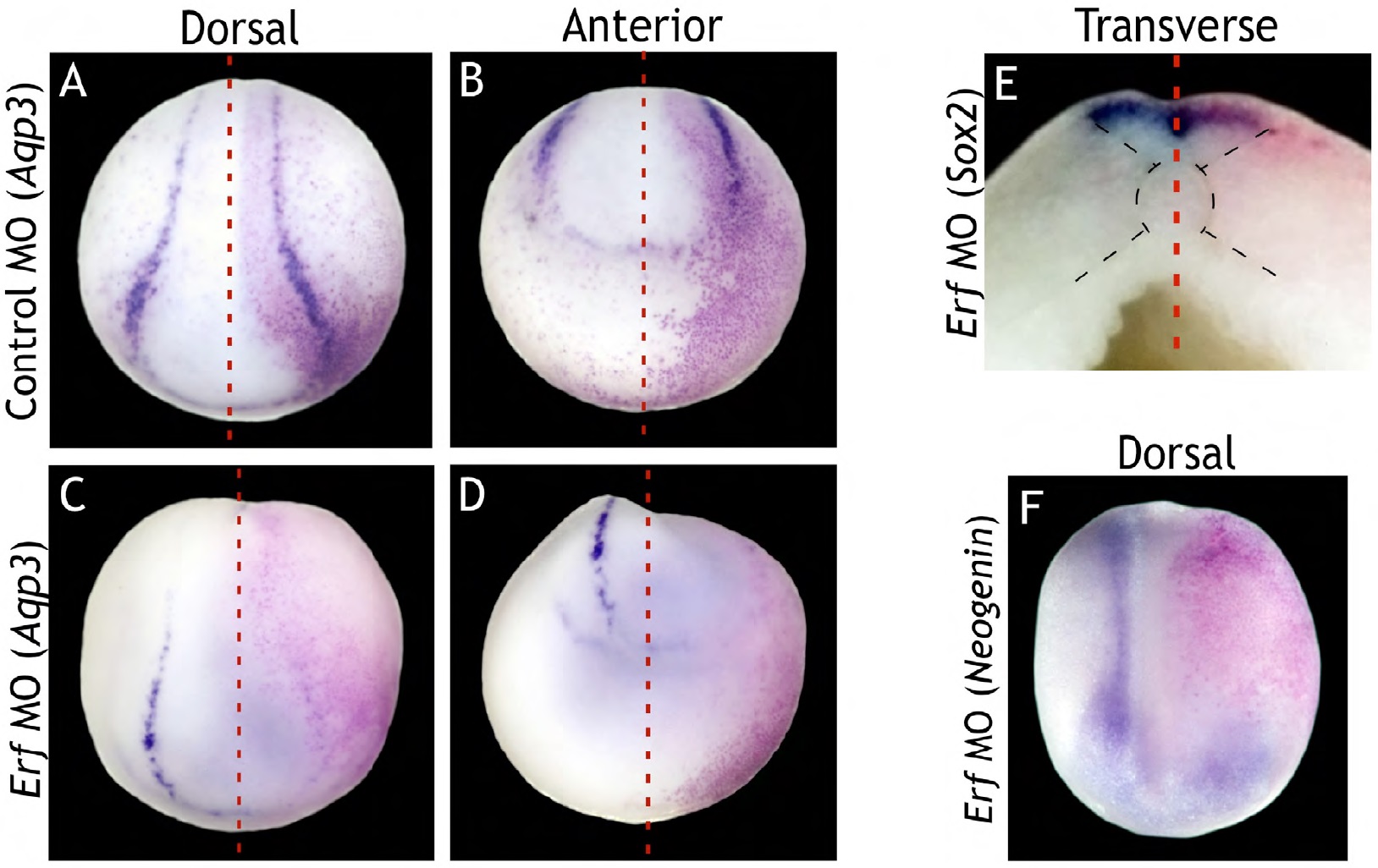 stained for Aqp3 at stage 14. (C,D) Dorsal (C) and anterior (D) views of 10 ng Erf MO, which resulted in a flattening of neural folds