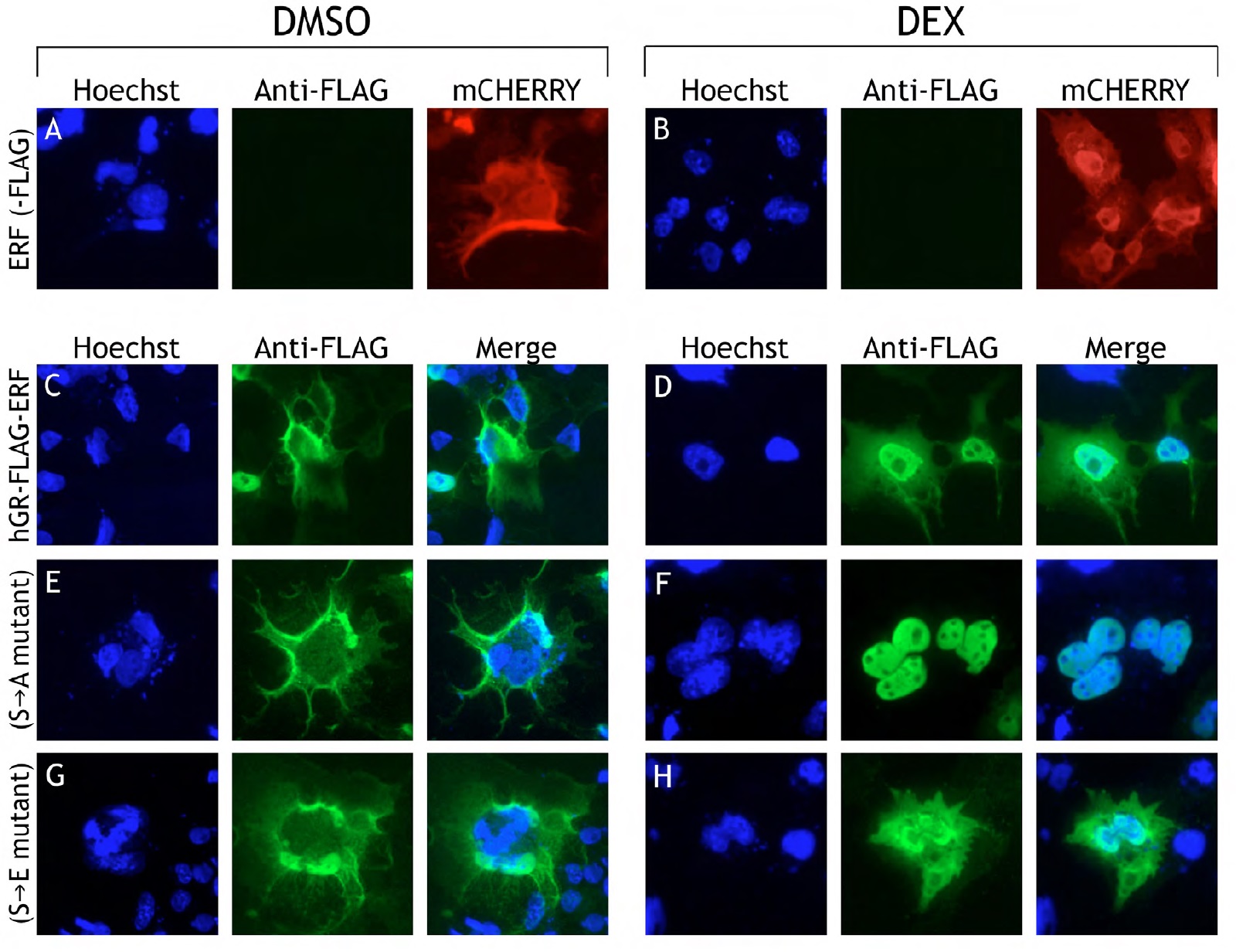 or 0.01% DMSO. (A,B) Negative control with Erf (no FLAG); transfected cells are indicated by mCHERRY fluorescence. (C,E,G)