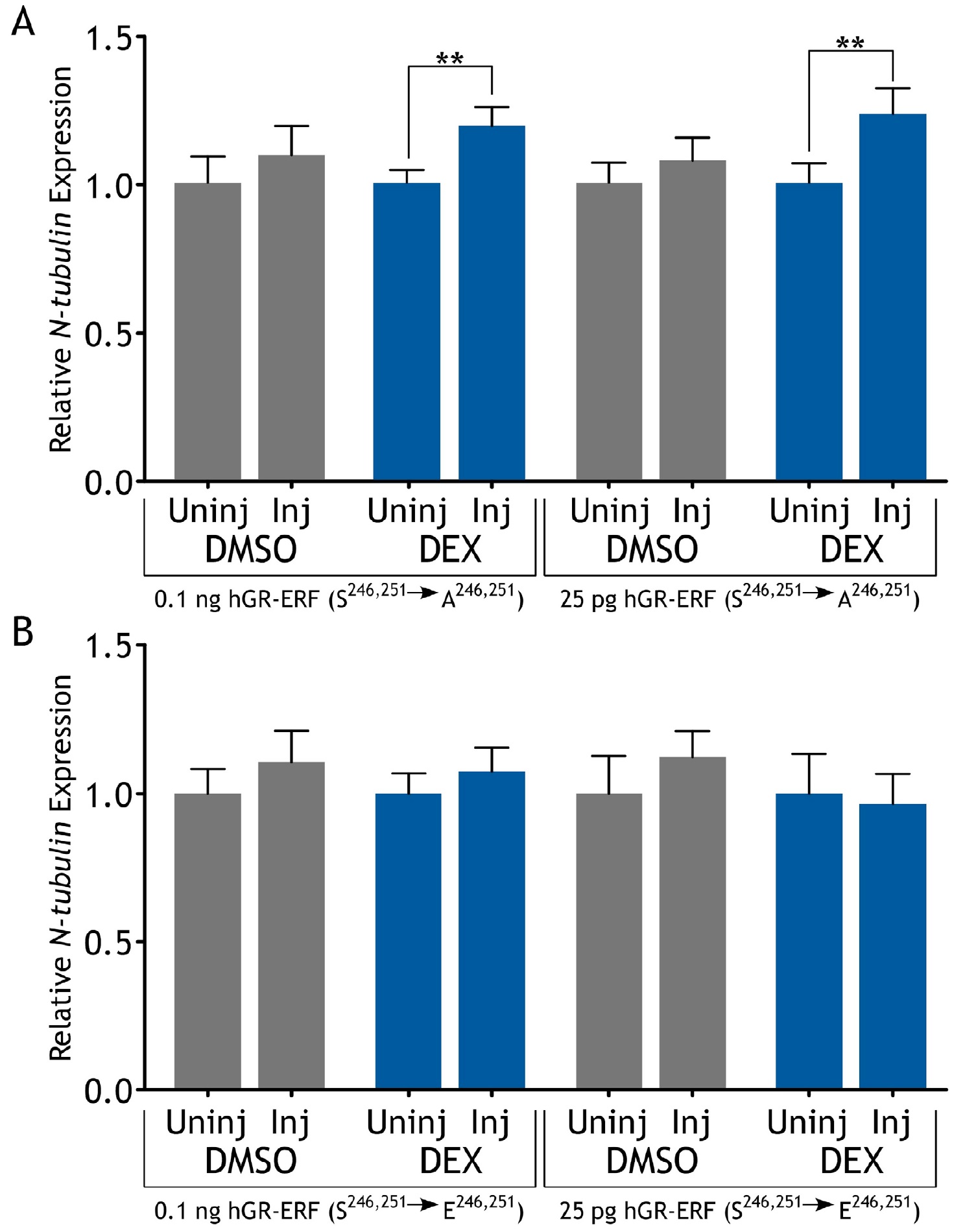 (A) Embryos injected with 0.1 ng or 25 pg hGR-Erf (S246,251âA246,251) mRNA and treated with dexamethasone showed a significant