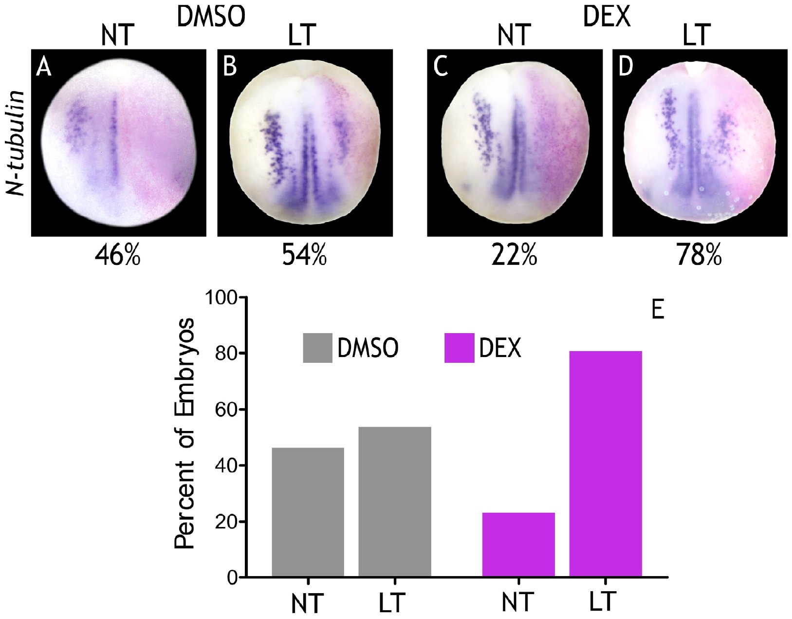 54% of embryos, respectively. (C,D) Embryos treated with dexamethasone exhibited no tubulin (NT) or low tubulin (LT) of N-tubulin